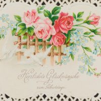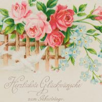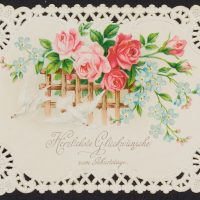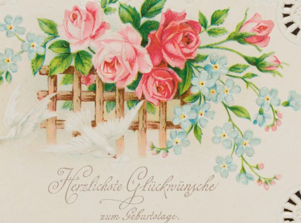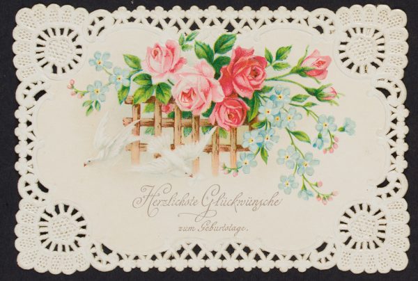 Unbekannt (19. Jahrhundert), Glückwunschkarte zum Geburtstag mit Rosen und Tauben, um 1900, um 1900, Chromolithographie