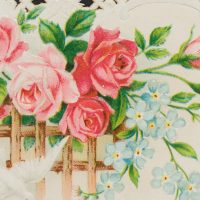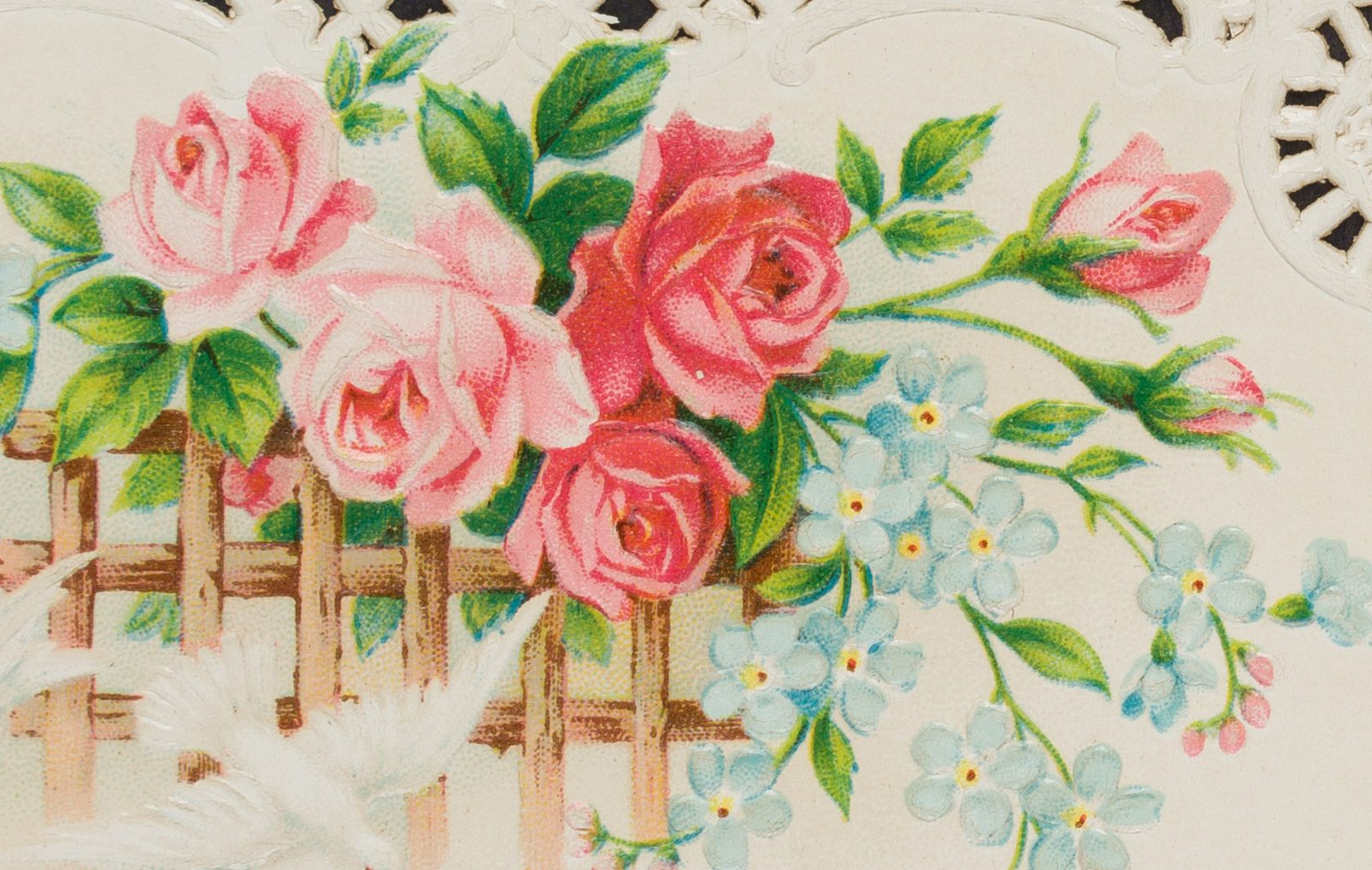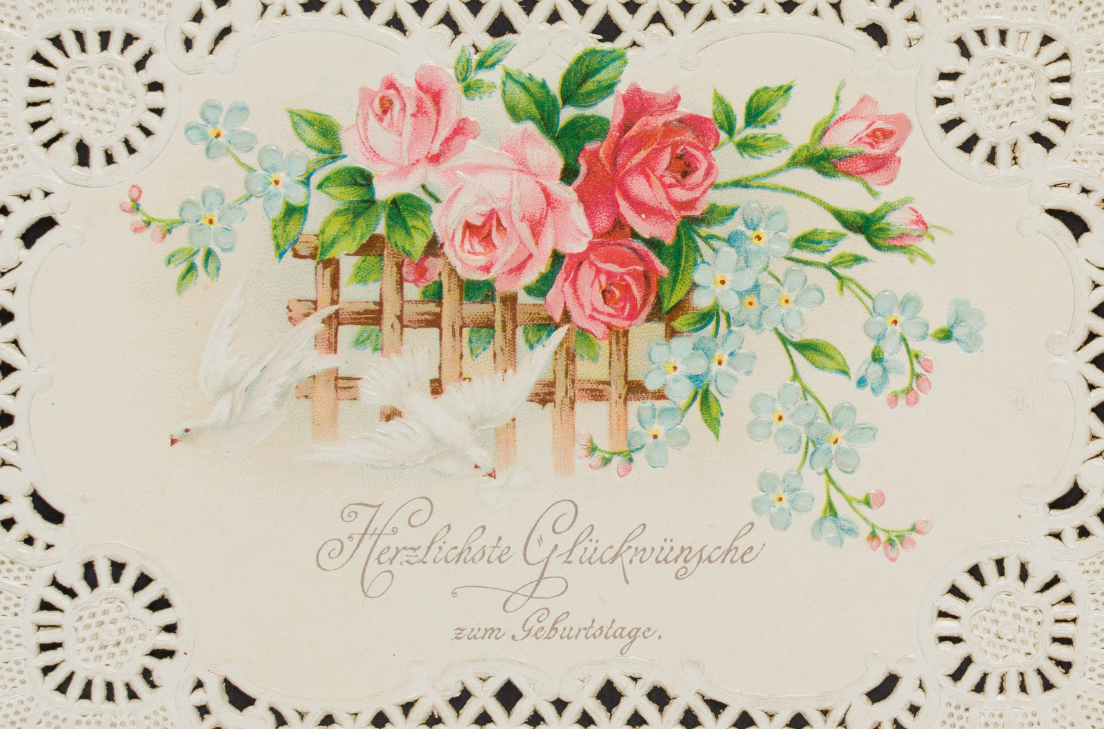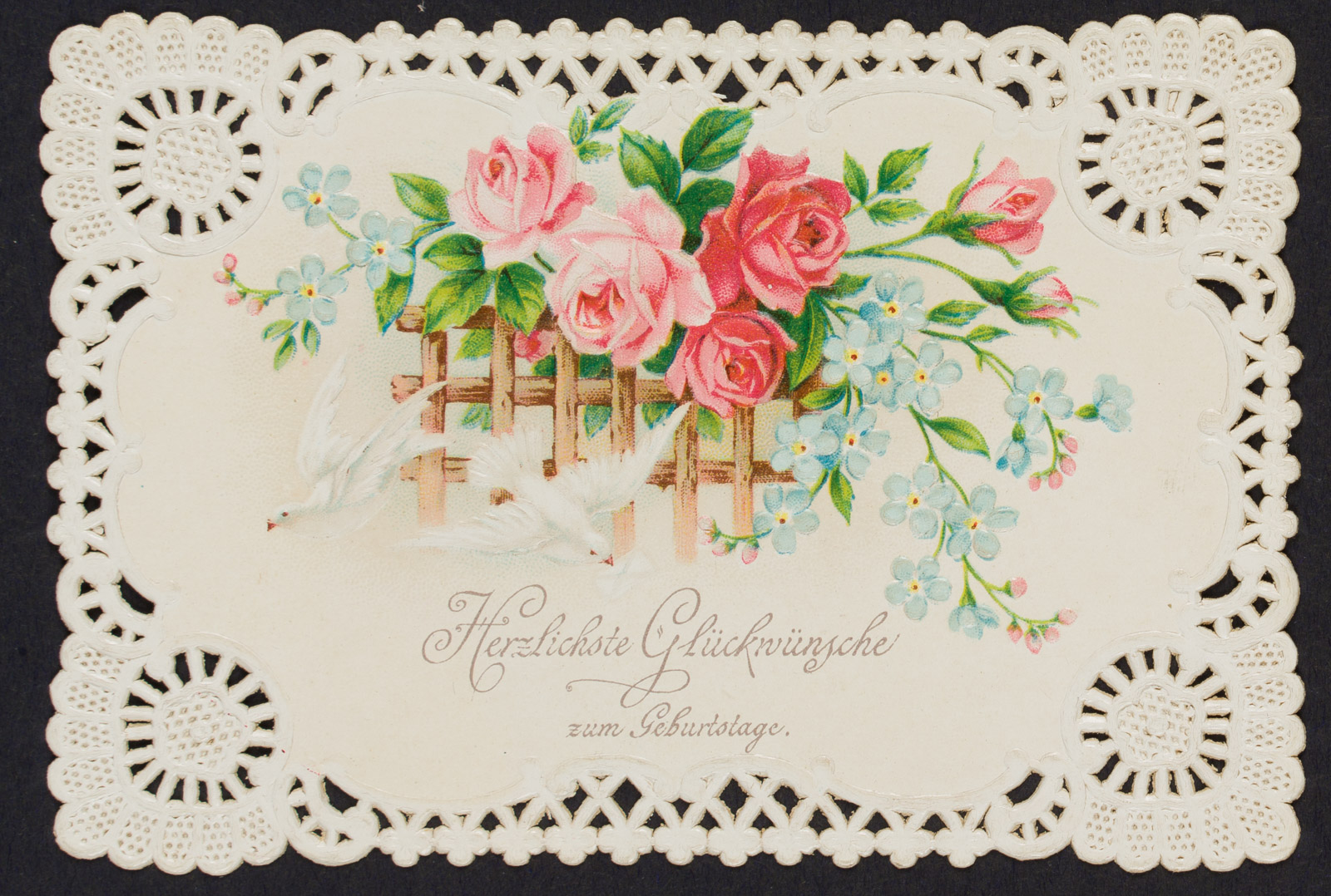 Unknown (19th century), Birthday greeting card with roses and doves, around 1900, c. 1900, Chromolithograph
