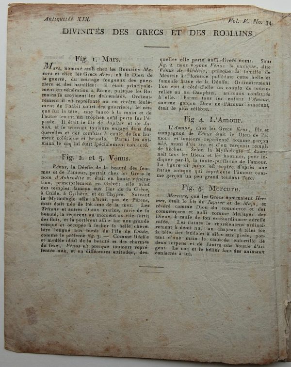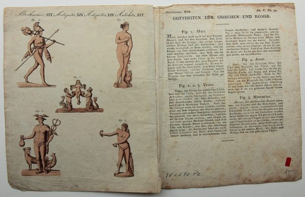 - Beschreibung: An Textblatt angeklebt. Blatt zeigt farbige Einzeldarstellungen von Gottheiten der klassischen Antike. Angeheftet ist ein begleitender Text in deutscher und französischer Sprache.