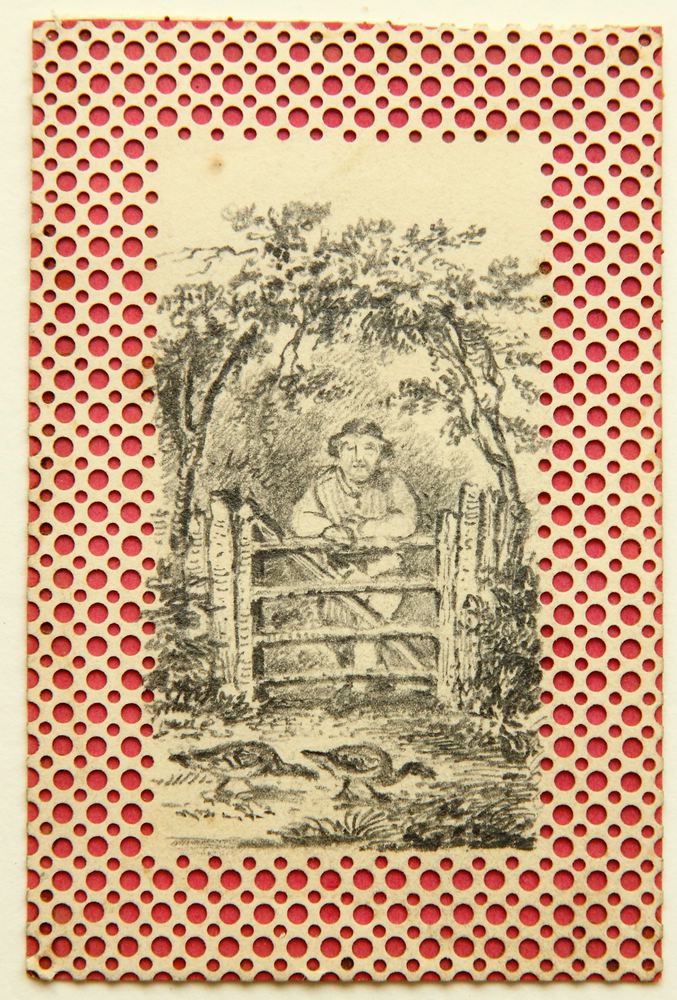Unknown (19th century), Greeting card, farmer leaning against the gate, 19th century, Pencil