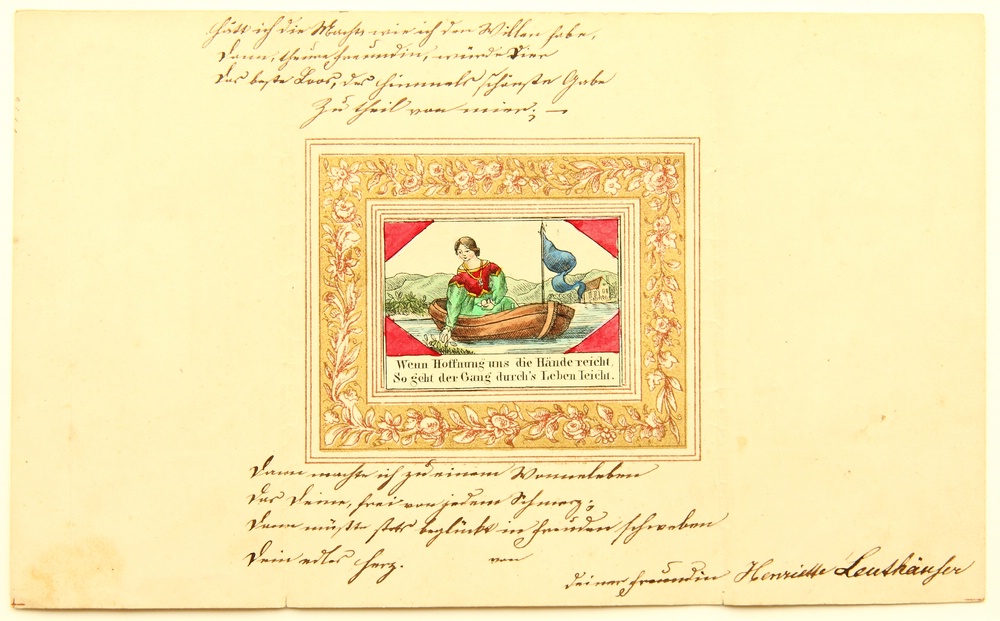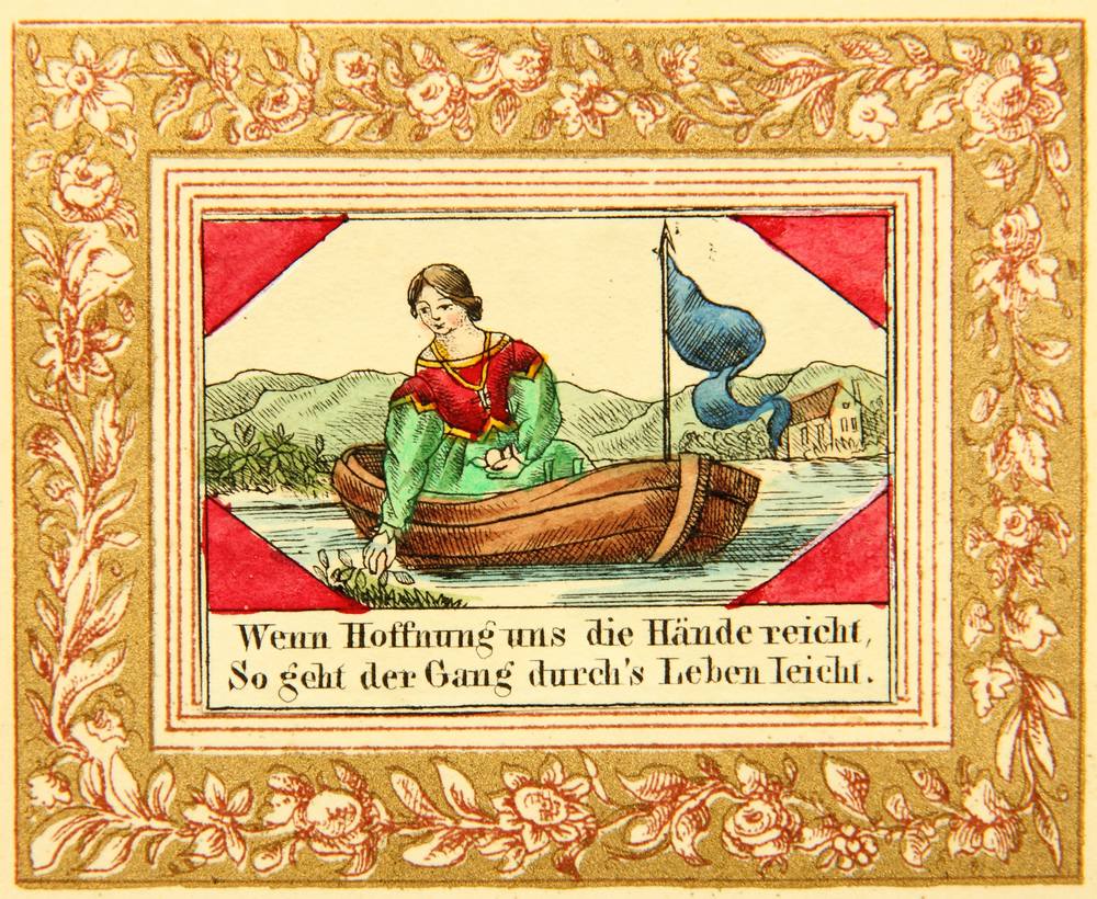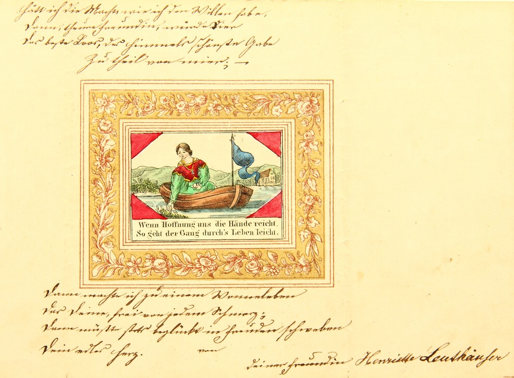 - Beschreibung: Grußkarte, Frau mit Kleid in kleinem Boot sammelt Pflanzen von Uferzone, 19. Jahrhundert, Kolorierter Kupferstich. Beschreibung: Kolorierter Kupferstich auf Papier. Unterhalb der Darstellung in der Druckplatte mit Sinnspruch “Wenn Hoffnung uns die Hände reicht, so geht der Gang durch’s Leben leicht. ” beschriftet. Ausserhalb der golde gerahmten Darstellung mit Tusche handschriftlich bezeichnet und von Henriette Leuthäuser unterschrieben.