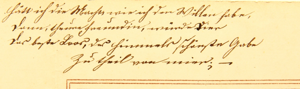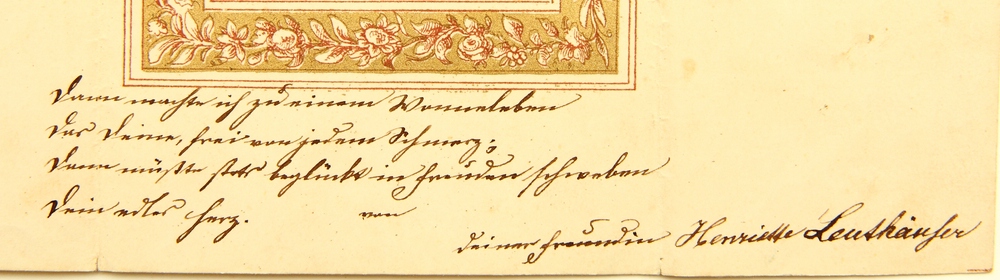 - Inscription: Inscribed below the image in the printing plate with the motto “Wenn Hoffnung uns die Hände reicht, so geht der Gang durch’s Leben leicht. Handwritten inscription outside the gold-framed image in ink and signed by Henriette Leuthäuser.