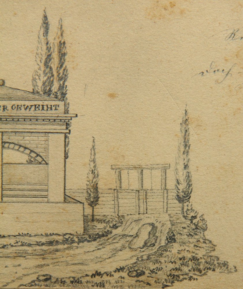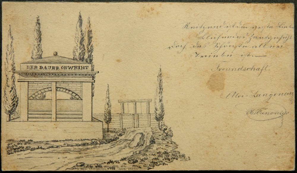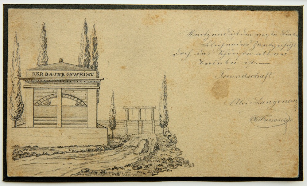 - Beschreibung: Auf dunklem Papier montiert Seitlich der Darstellung befindet sich ein handschriftlicher Text mit der Signatur “Alois Langenau Ob: Canonier”.