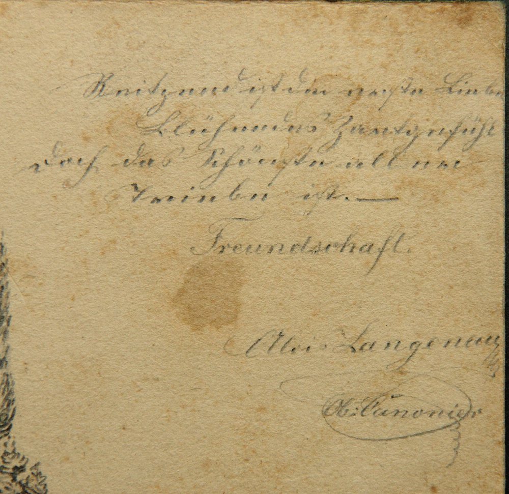 - Description: Mounted on dark paper On the side of the image is a handwritten text with the signature “Alois Langenau Ob: Canonier”.