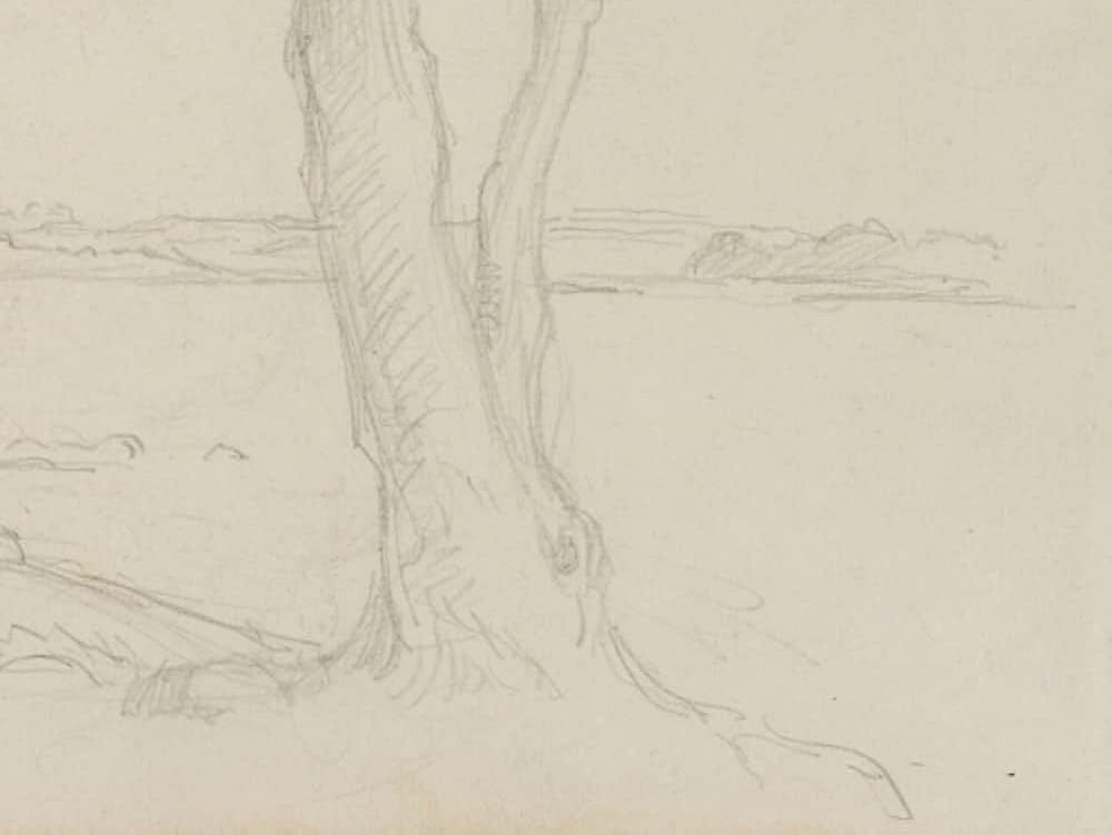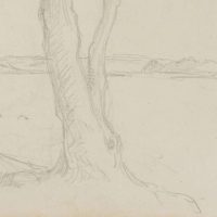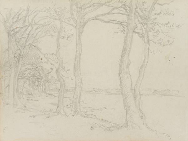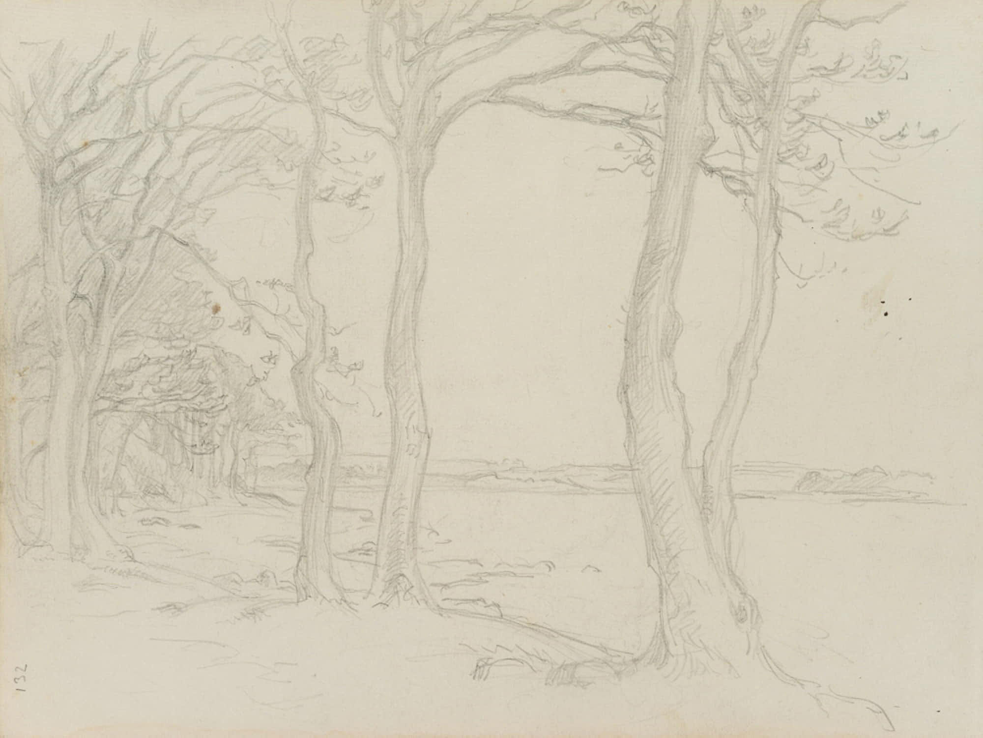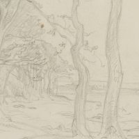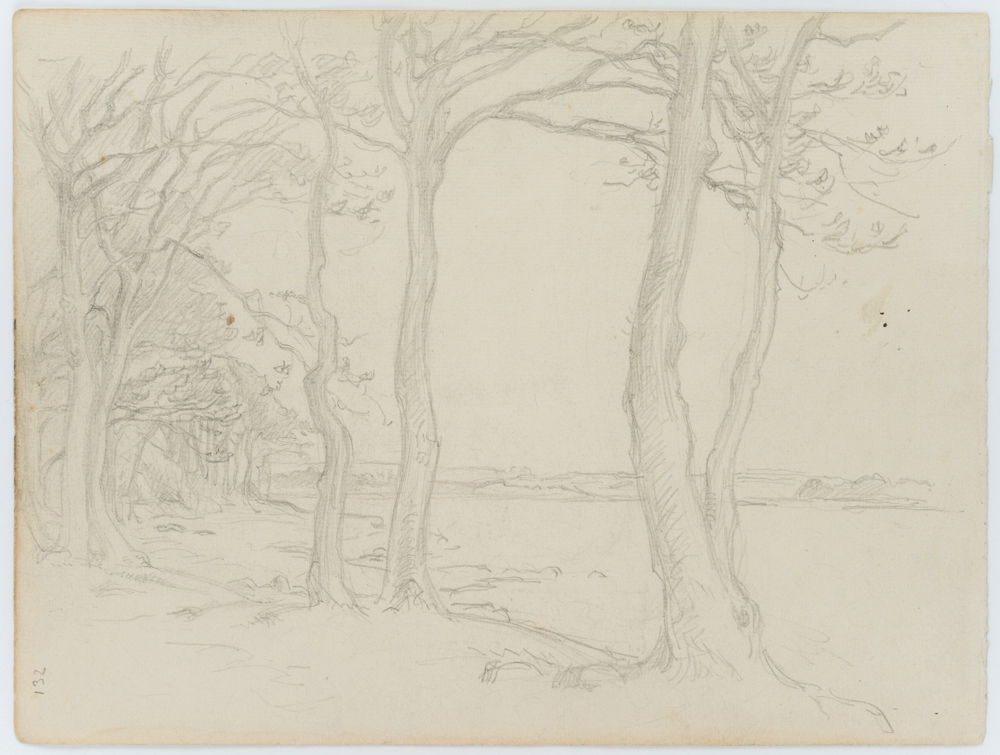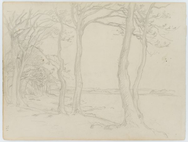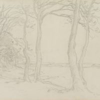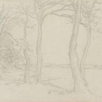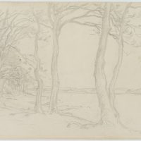 - Description: Shore landscape drawn with quick strokes with sparse trees defoliated by the autumn wind. The sheet comes from a collection of drawings by Scandinavian artists from the late 19th century.