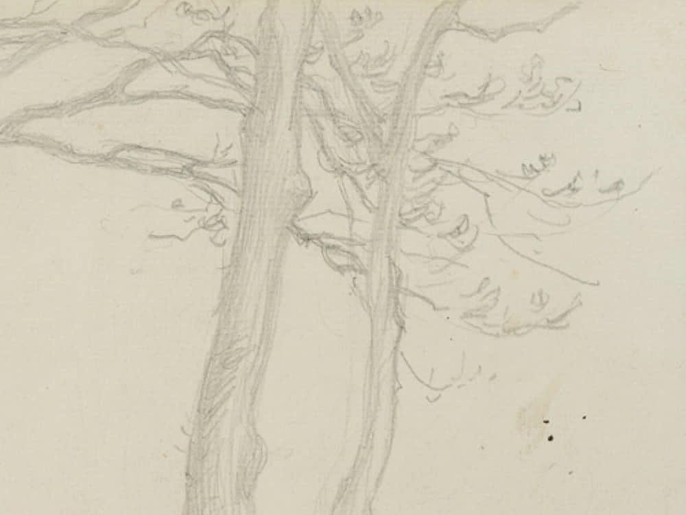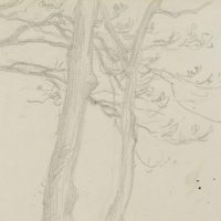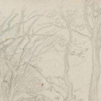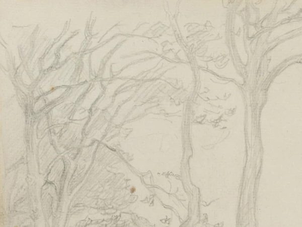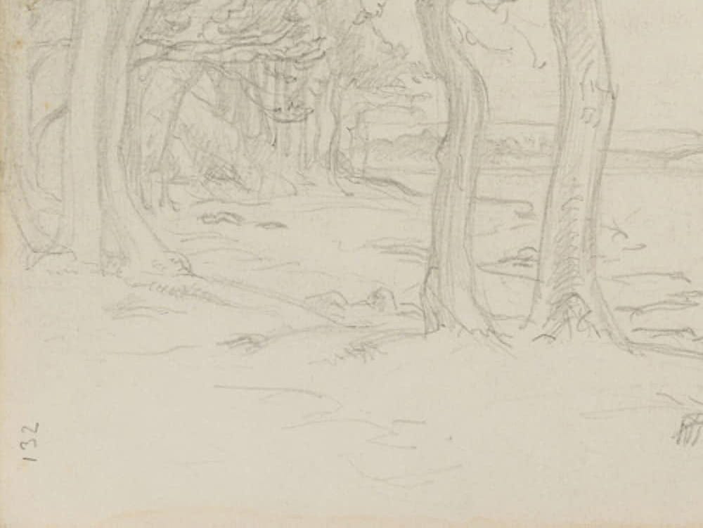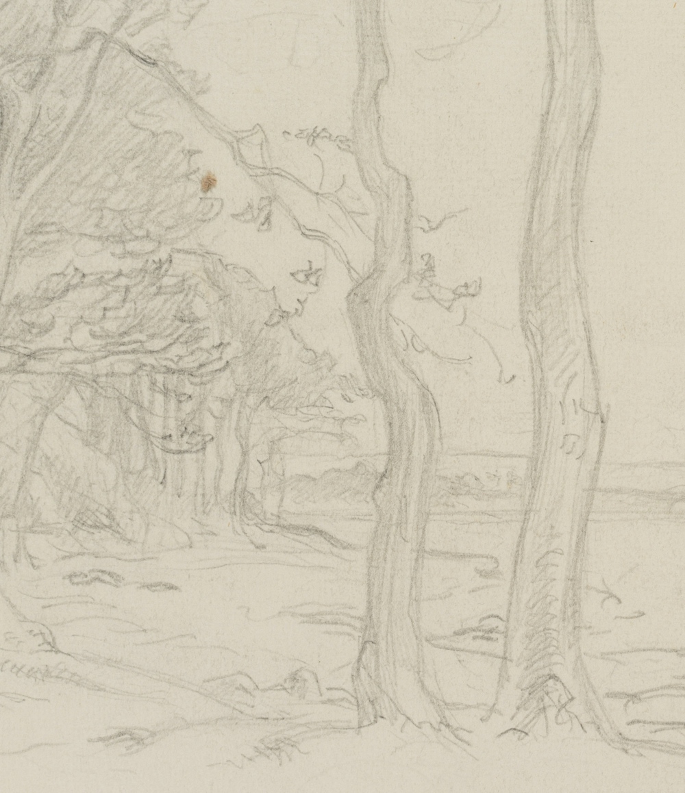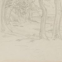 - Description: Shore landscape drawn with quick strokes with sparse trees defoliated by the autumn wind. The sheet comes from a collection of drawings by Scandinavian artists from the late 19th century.