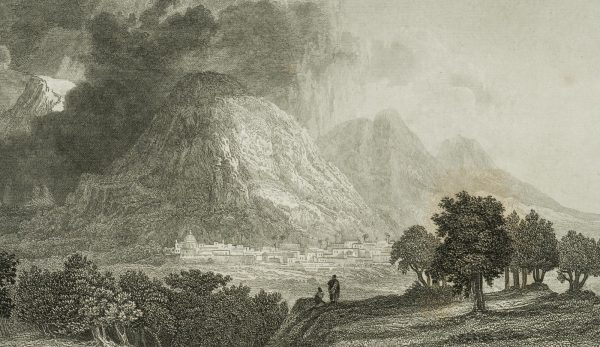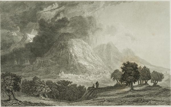 Unbekannt (19. Jahrhundert), Heroische Landschaftsdarstellung, Arimathäa (Ramah) mit monumentaler Gebirgskulisse und biblisch anmutenden Staffagefiguren im Vordergrund, Palestina, 19. Jahrhundert, Stahlstich