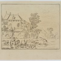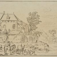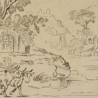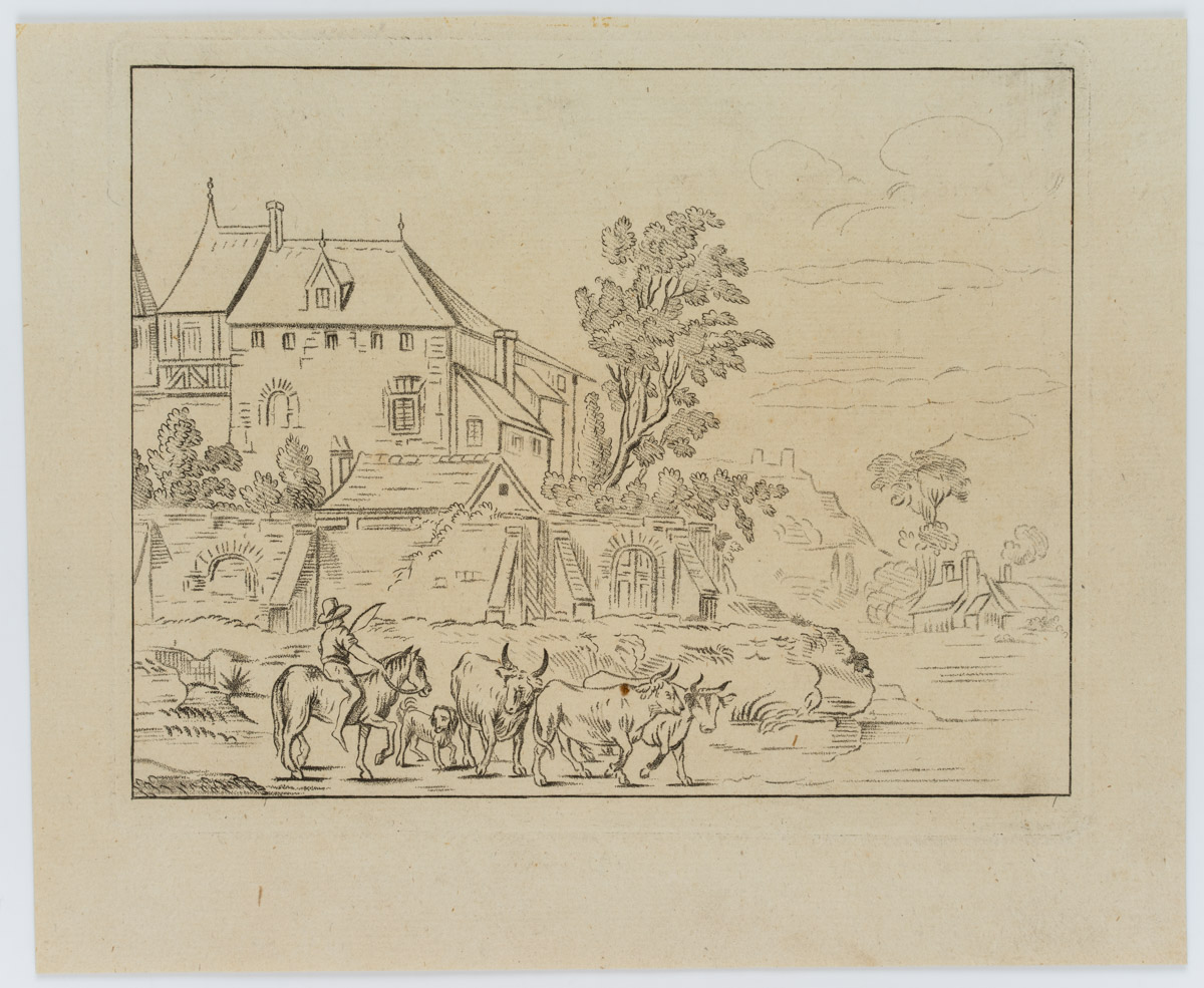 - Beschreibung: Ruhig komponierte Darstellung eines berittenen Hirten mit seiner Viehherde. Im Hintergrund erhebt sich eine niedrige Stadtmauer mit einem festungshaften Gebäudekomplex. Bemerkenswert ist die weiche Darstellung der Linien durch präzise gesetzte Punktwolken.