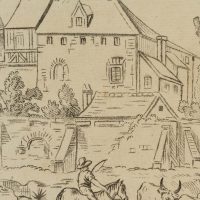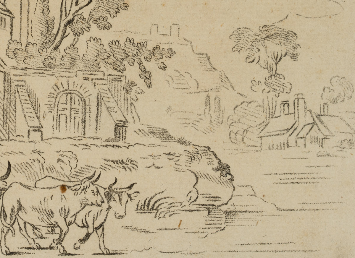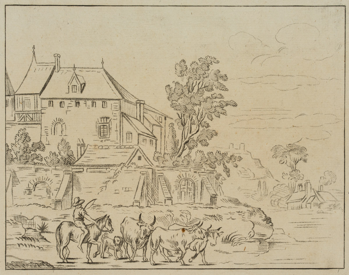 - Description: Calmly composed depiction of a mounted shepherd with his herd of cattle. In the background rises a low city wall with a fortress-like complex of buildings. The soft depiction of the lines through precisely placed point clouds is remarkable.