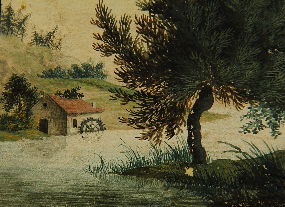 Unbekannt (19. Jahrhundert), Hof und Mühle am Fluss, um 1820, Gouache
