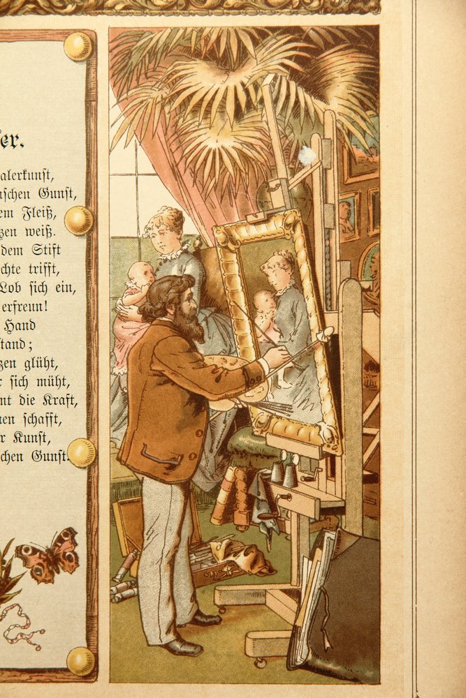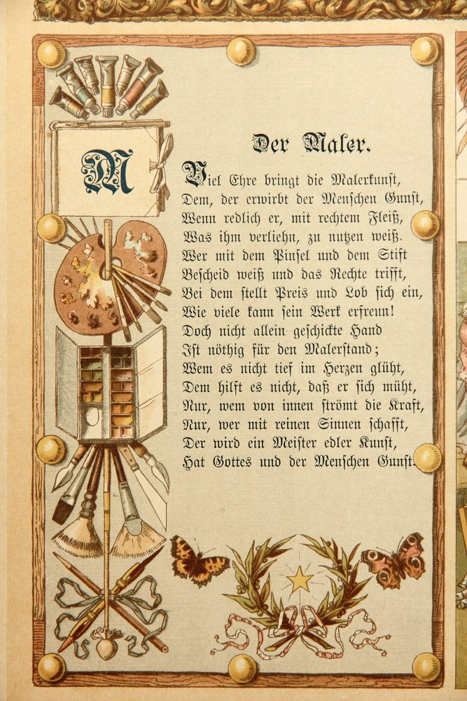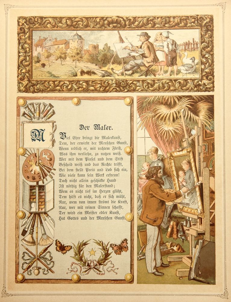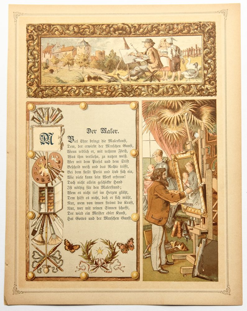 - Beschreibung: Sehr schöne bildliche und lyrische Hommage auf die Malkunst. Stammt aus einer Serie ähnlicher Darstellungen anderer Berufszweige. Bitte beachten Sie dazu unser weiteres Angebot.