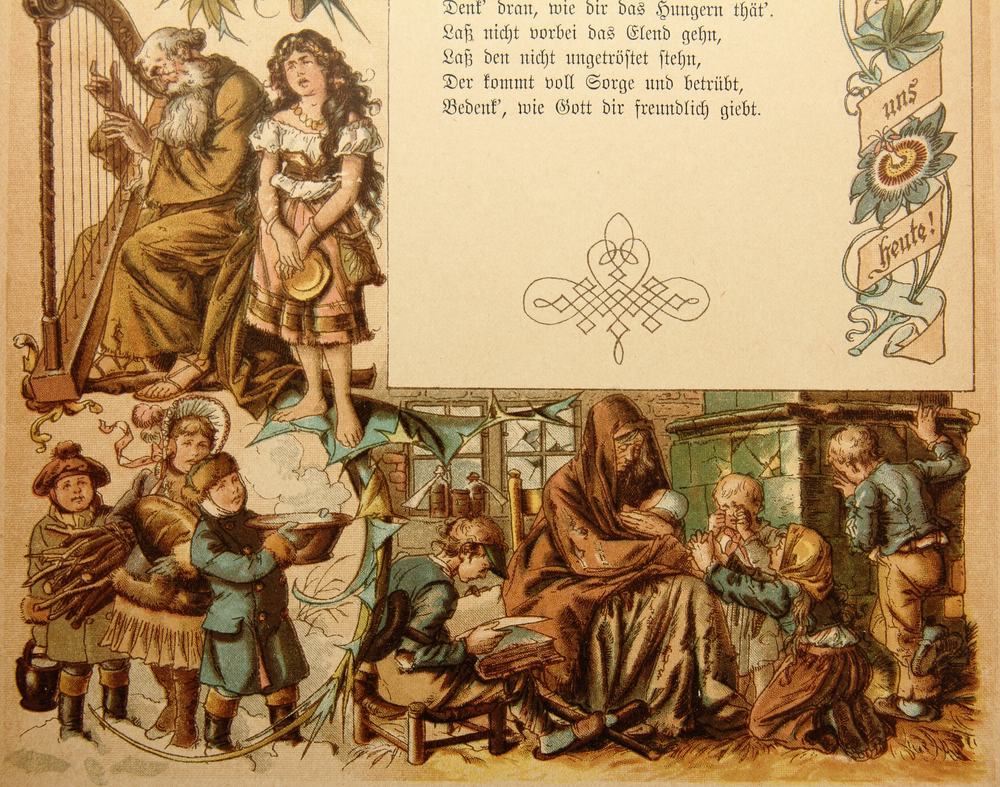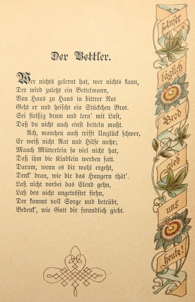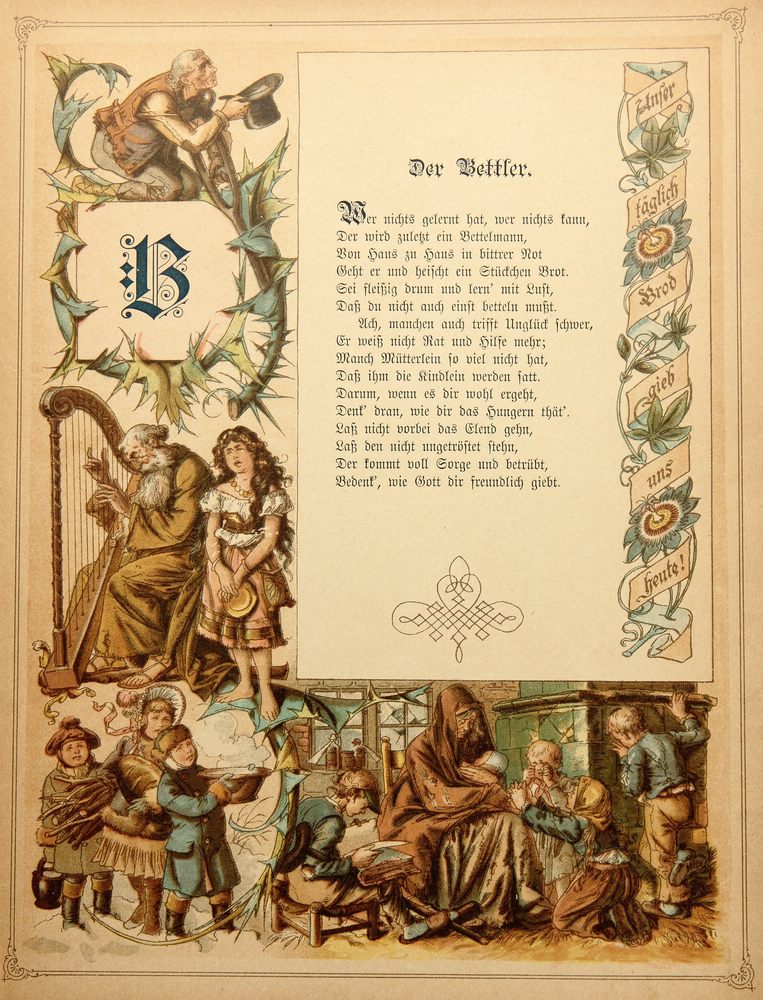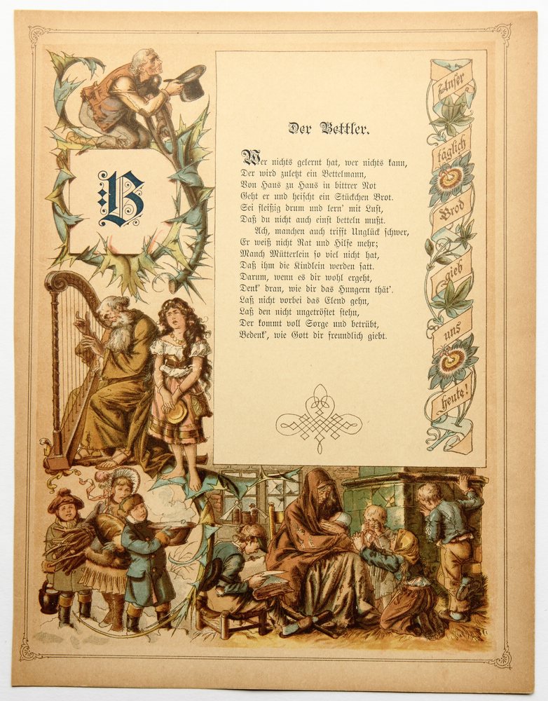 Unknown (19th century), Homage to a beggar, depiction with moralising poem, 19th century, Chromolithograph
