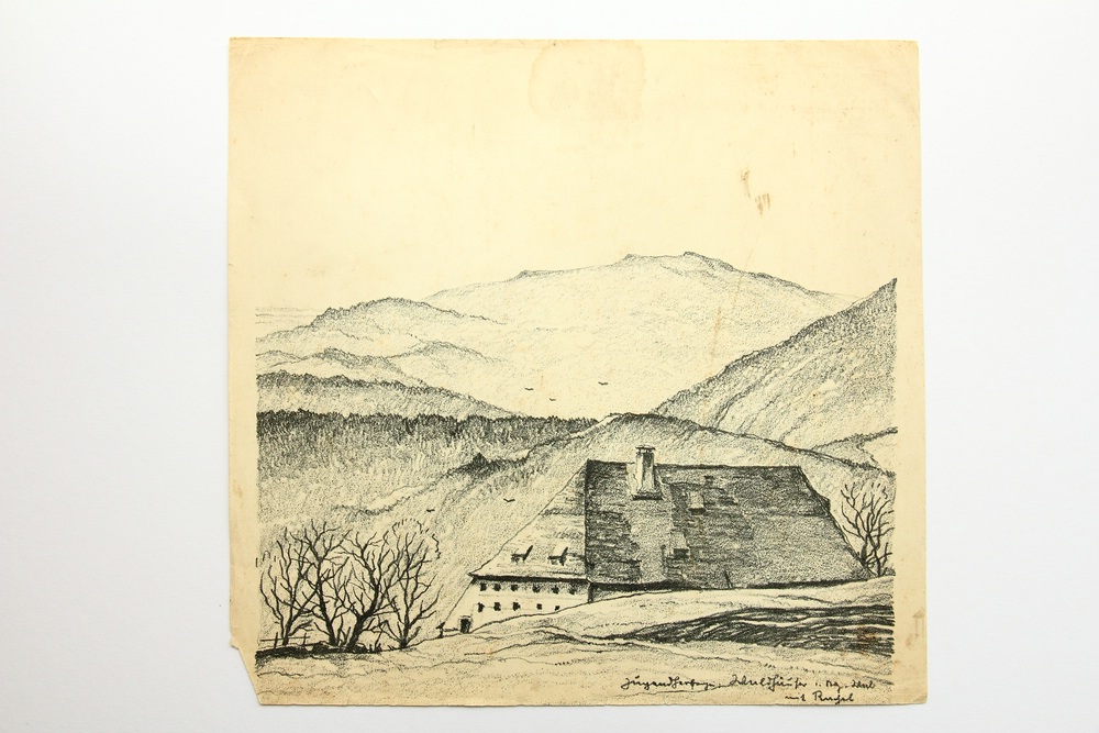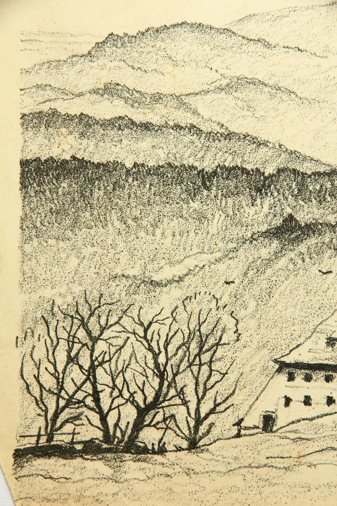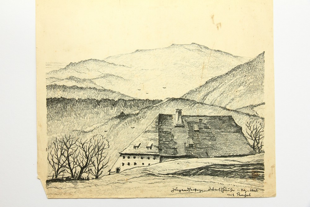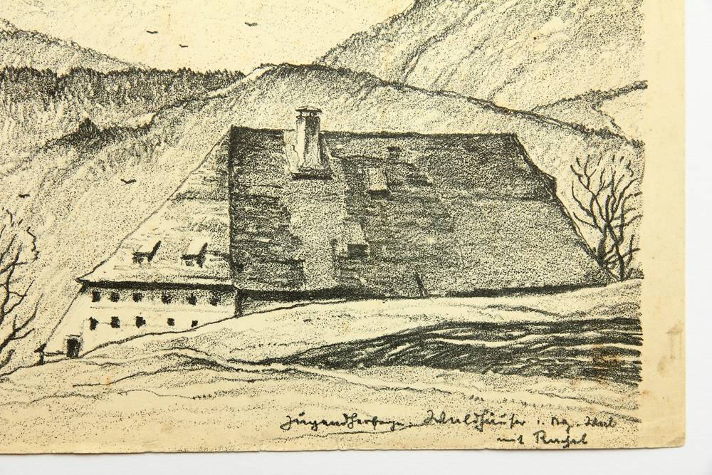 Unbekannt (19. Jahrhundert), Hügellandschaft mit Jugendherberge, um 1900, Lithographie