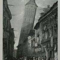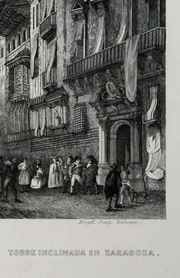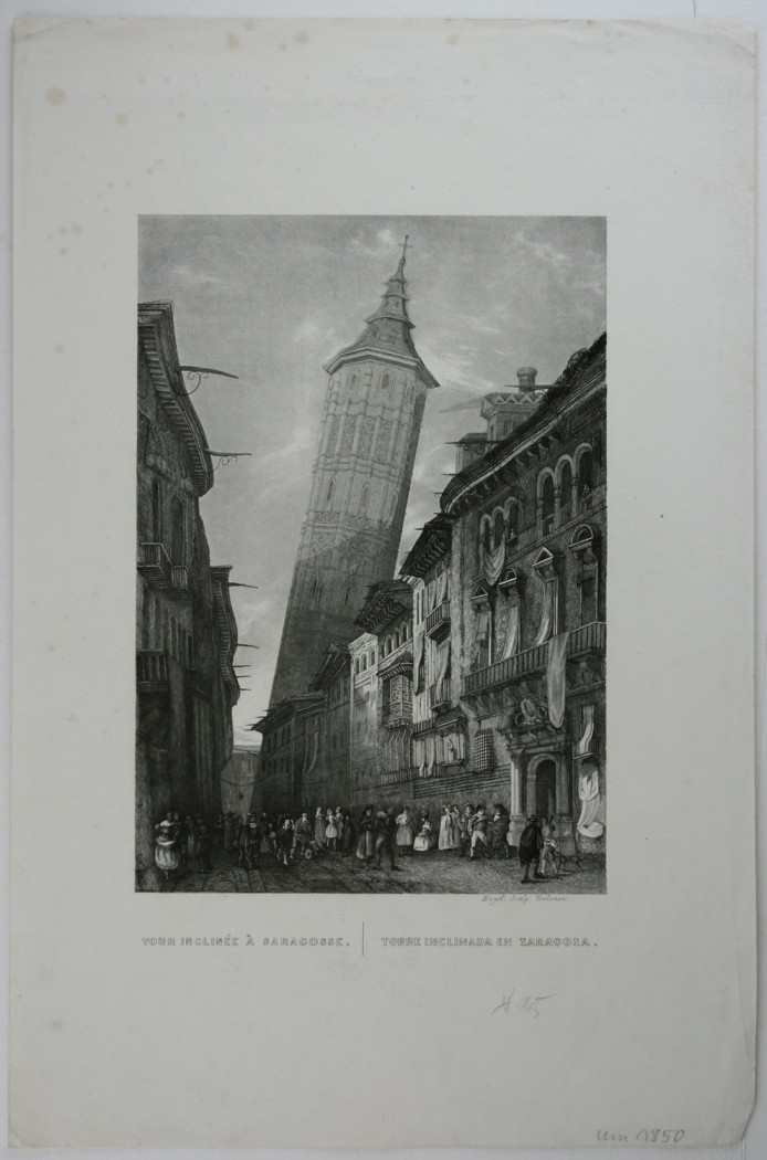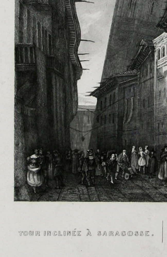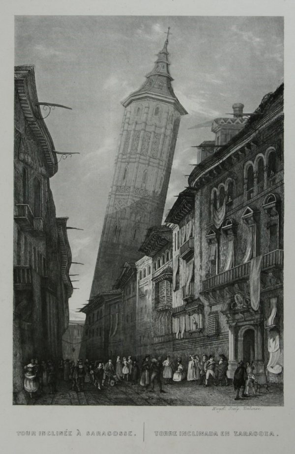 - Description: Steel engraving by Huyot, inscribed: “Huyot Sculp. Toulouse Tour inclinée à Saragosse Torre inclinada en Zaragoza”. Very impressive view of the leaning tower, in the foreground a busy alley.