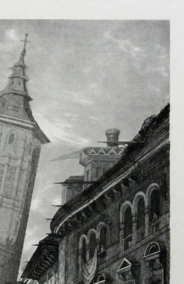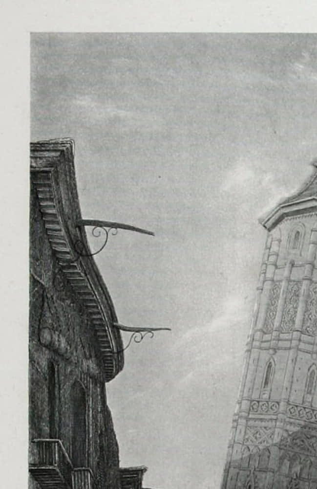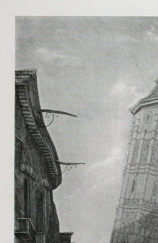 - Beschreibung: Stahlstich von Huyot, bezeichnet: “Huyot Sculp. Toulouse Tour inclinée à Saragosse Torre inclinada en Zaragoza”. Sehr beeindruckende Ansicht des schiefen Turms, im Vordergrund eine belebte Gasse.
