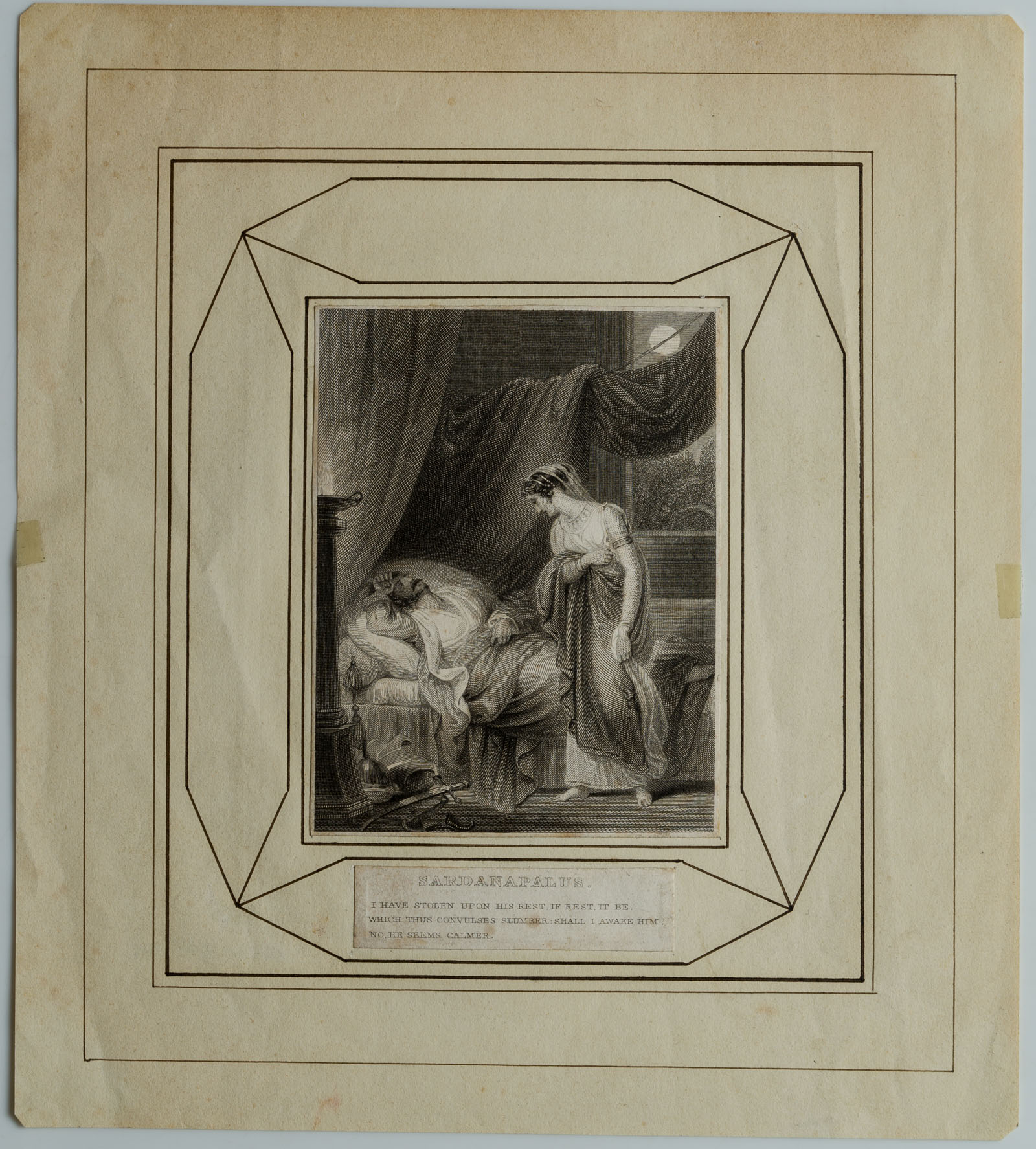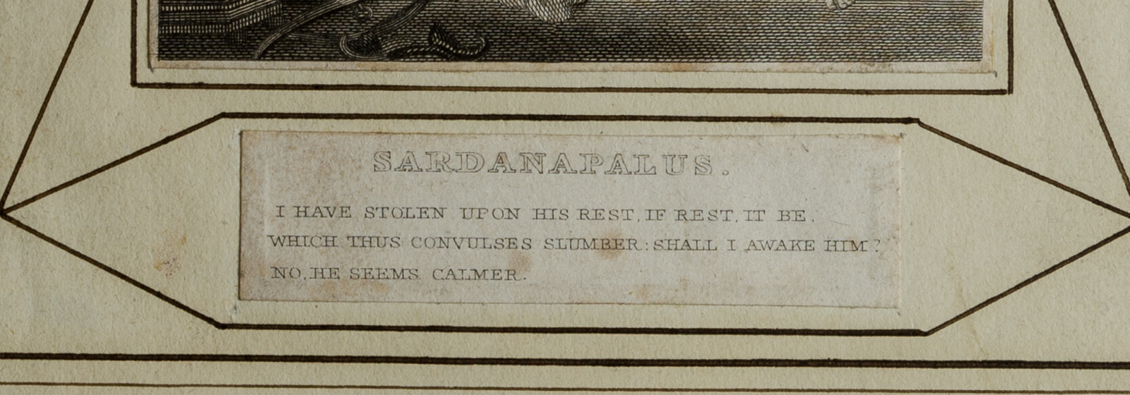 - Description: Below the print, a strip of paper with the extract from Lord George Byron’s tragedy ‘Sardanapalus’ (1821) is attached to the mount: “I HAVE STOLEN UPON HIS REST, IF REST. IT BE. WHICH THUS CONVULSES SLUMBER: SHALL I AWAKE HIM? NO HE SEEMS CALMER.”.