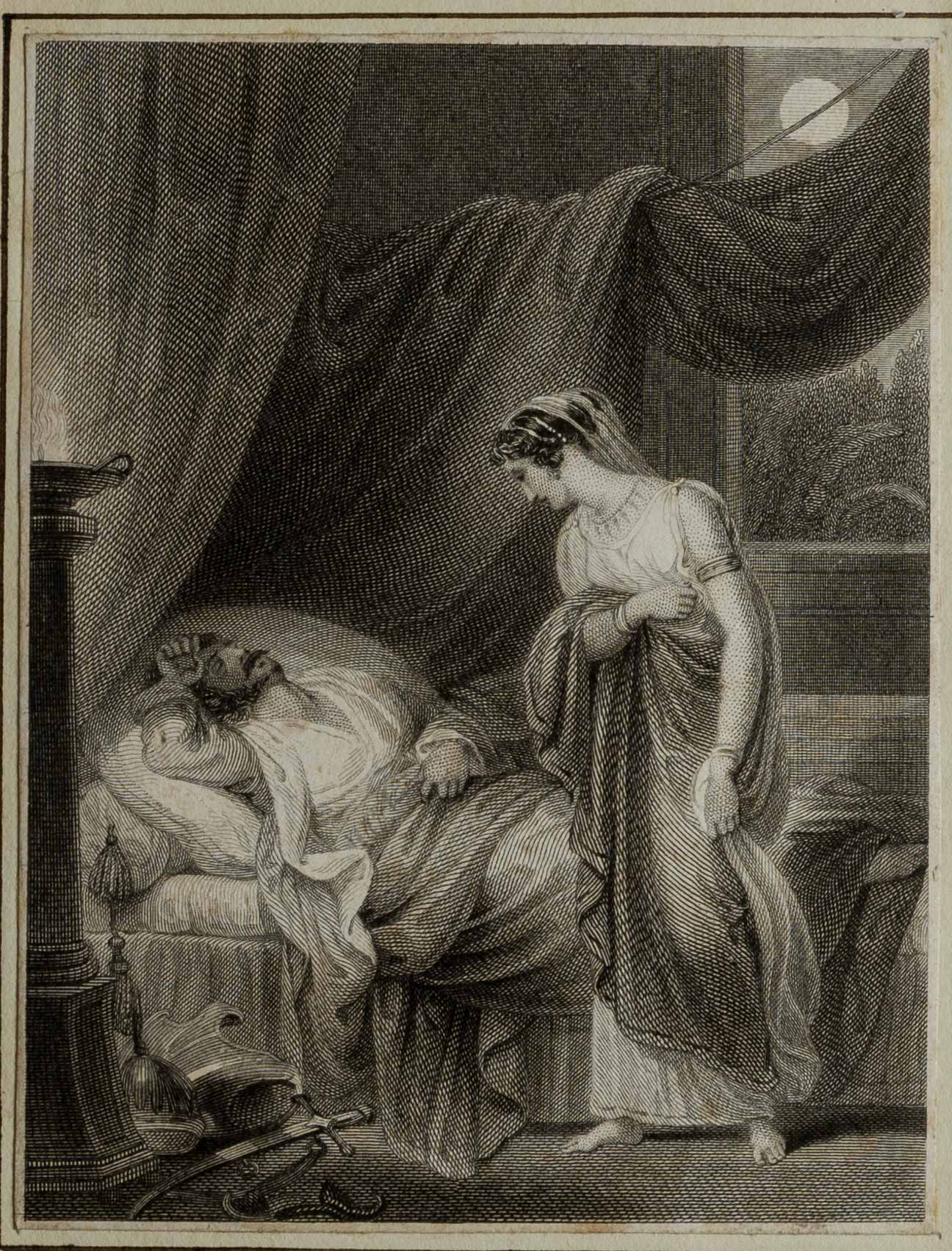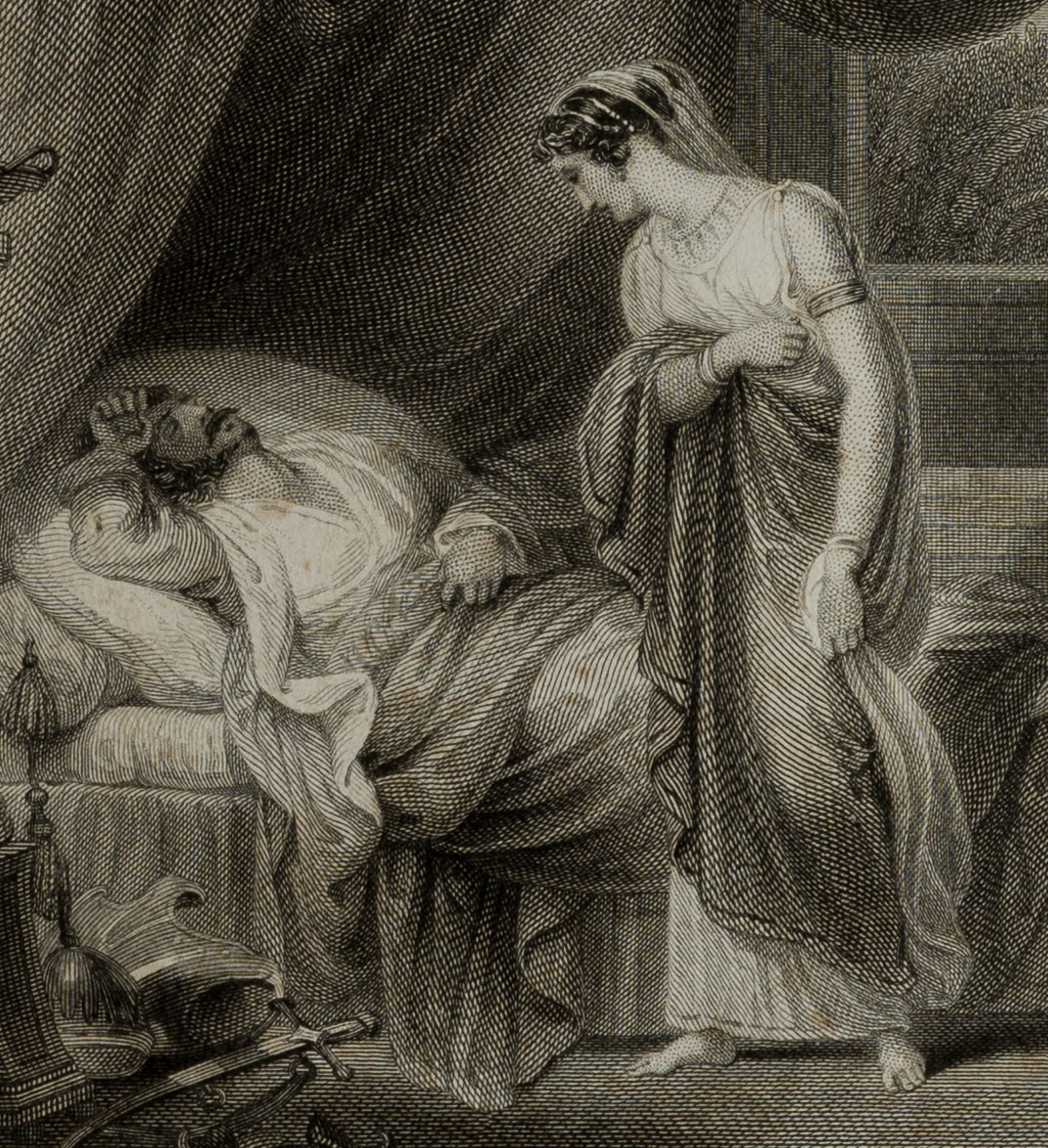 Unknown (19th century), Illustration from Lord Byron’s tragedy ‘Sardanapalus’ with Saradanapalus’ favourite concubine Myrrha at the bedside of the sleeping king, 19th century, Steel engraving