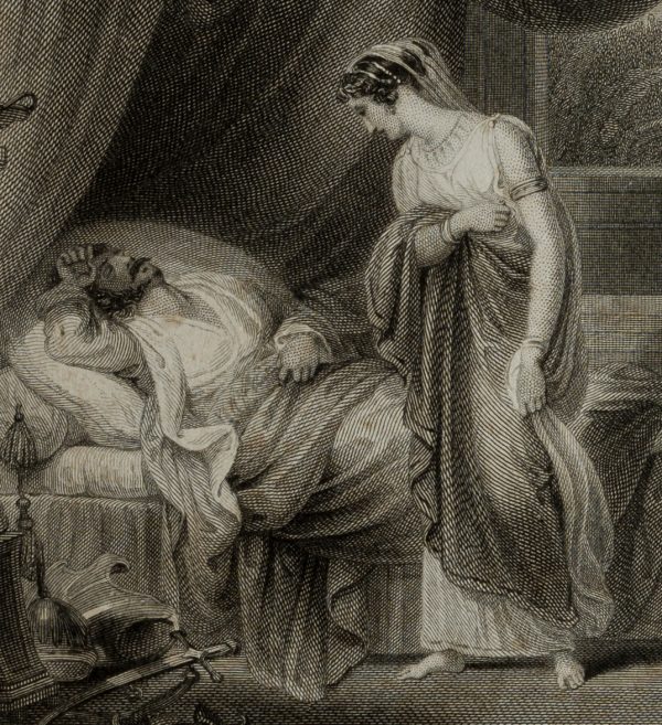 Unbekannt (19. Jahrhundert), Illustration aus Lord Byrons Tragödie ‘Sardanapalus’ mit Saradanapalus Lieblingskonkubine Myrrha am Bett des schlafenden Königs, 19. Jahrhundert, Stahlstich