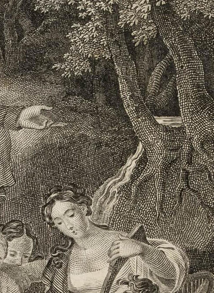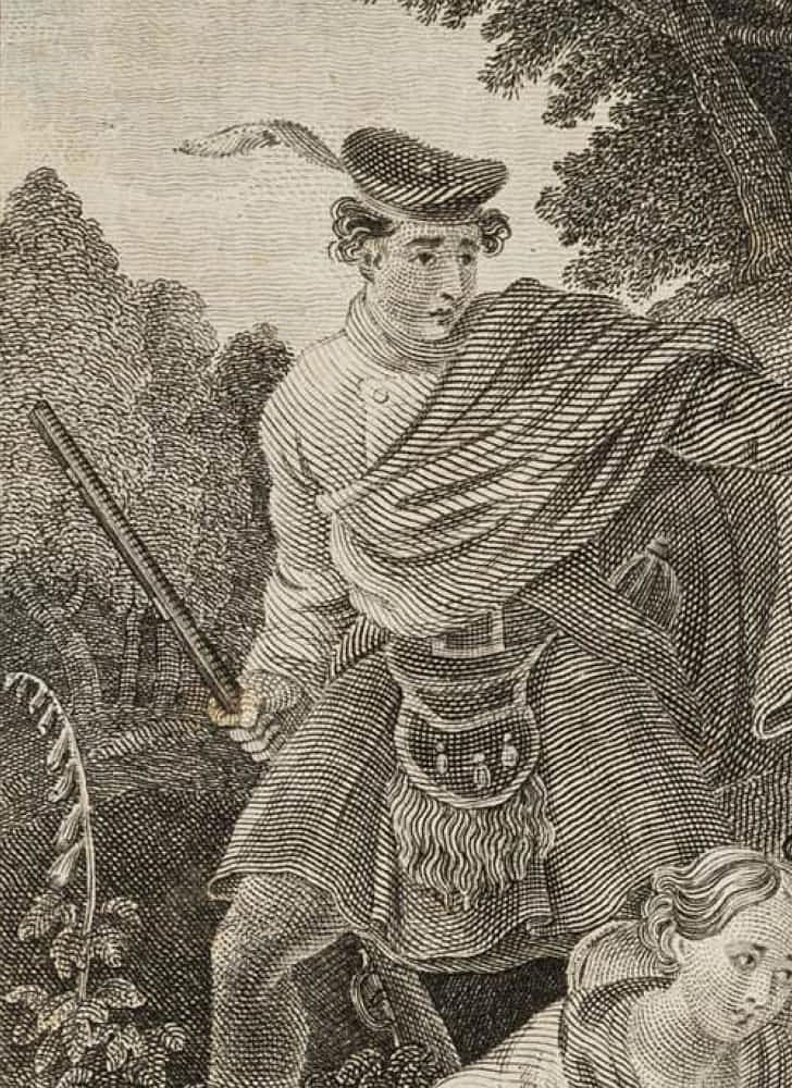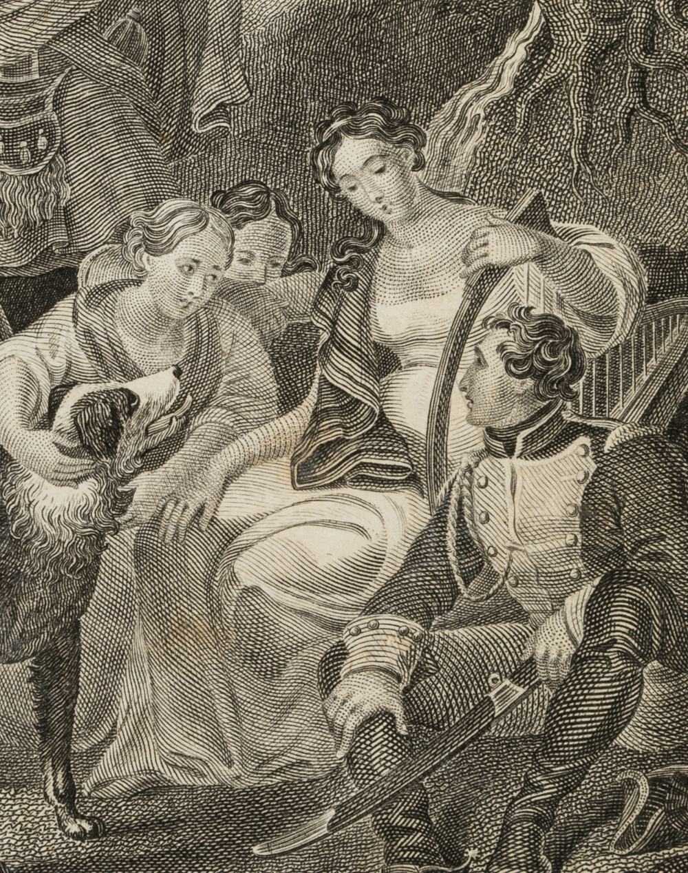 • Beschreibung: Miniaturisierte Kostümszene als Illustration einer Ausgabe von Waverley, Walter Scotts Historienroman. Zeigt eine ruhige Familienszene mit einem Soldaten im Freien, ein schottischer Jakobit tritt im Hintergrund aus dem Wald hervor.