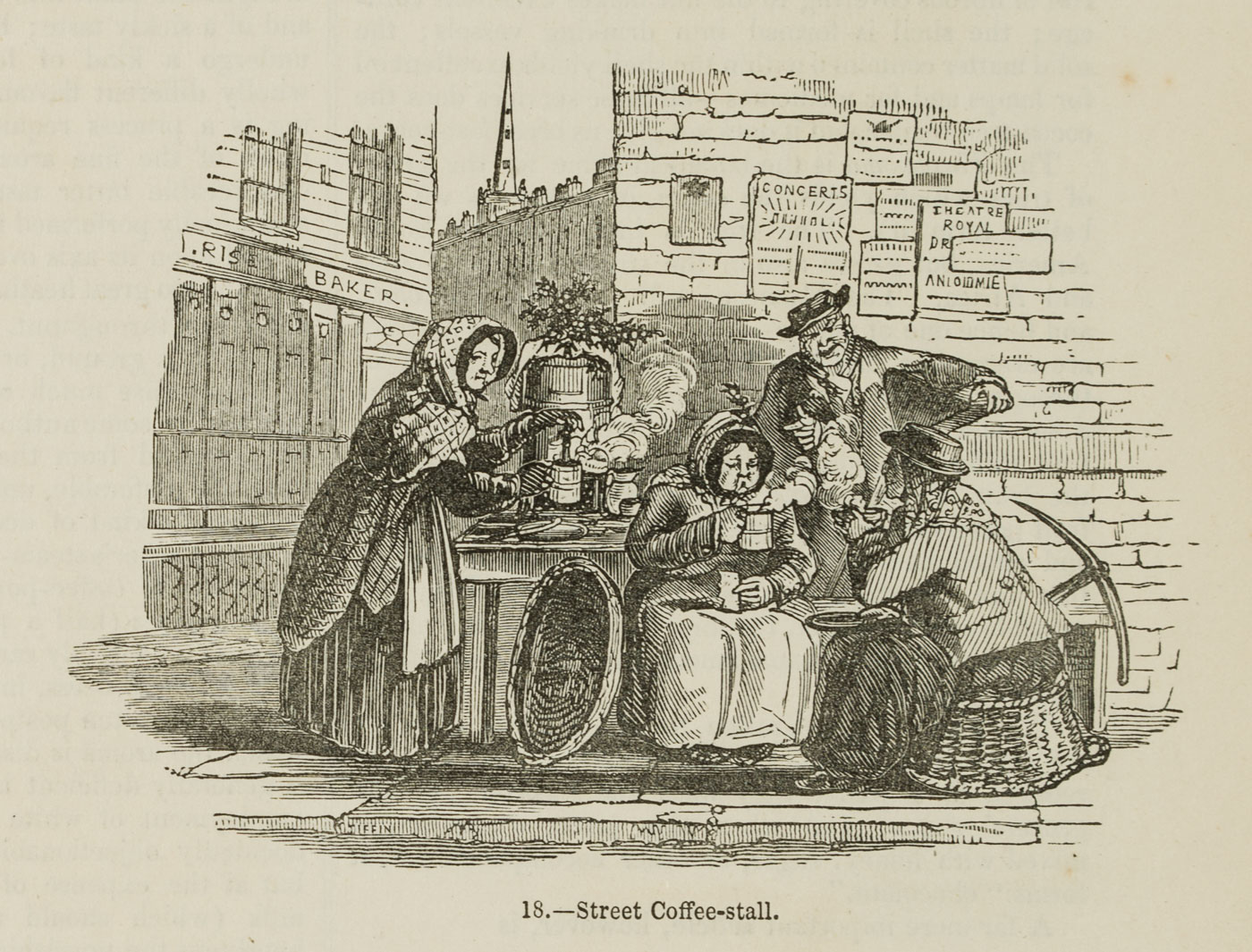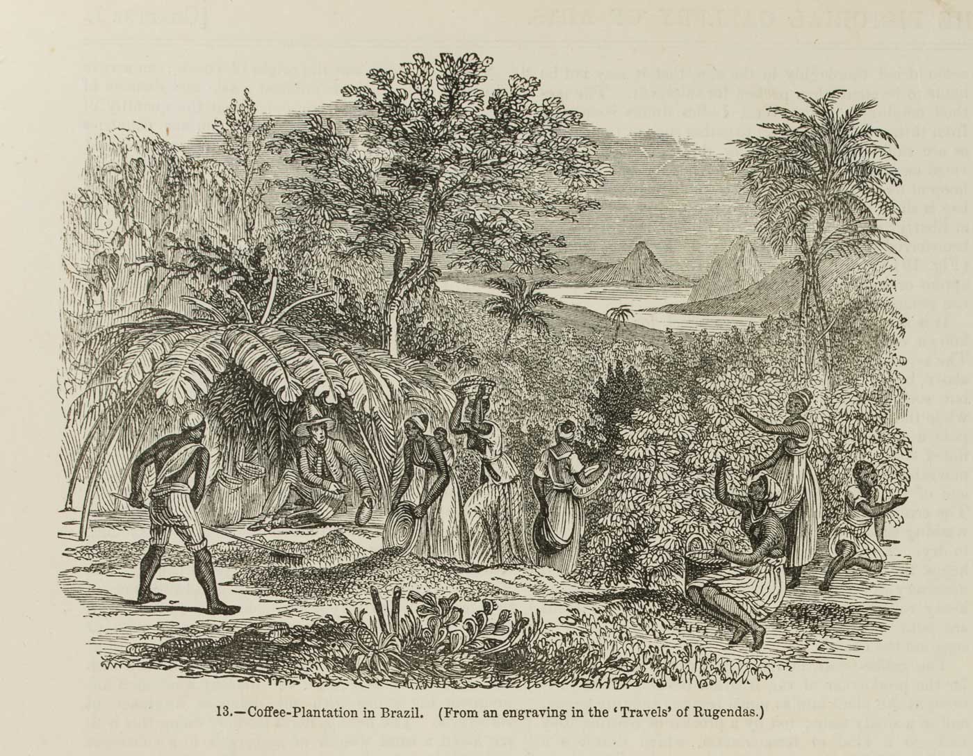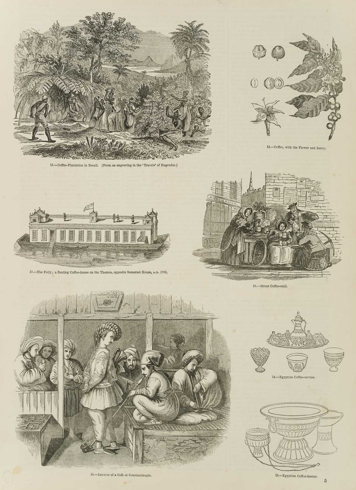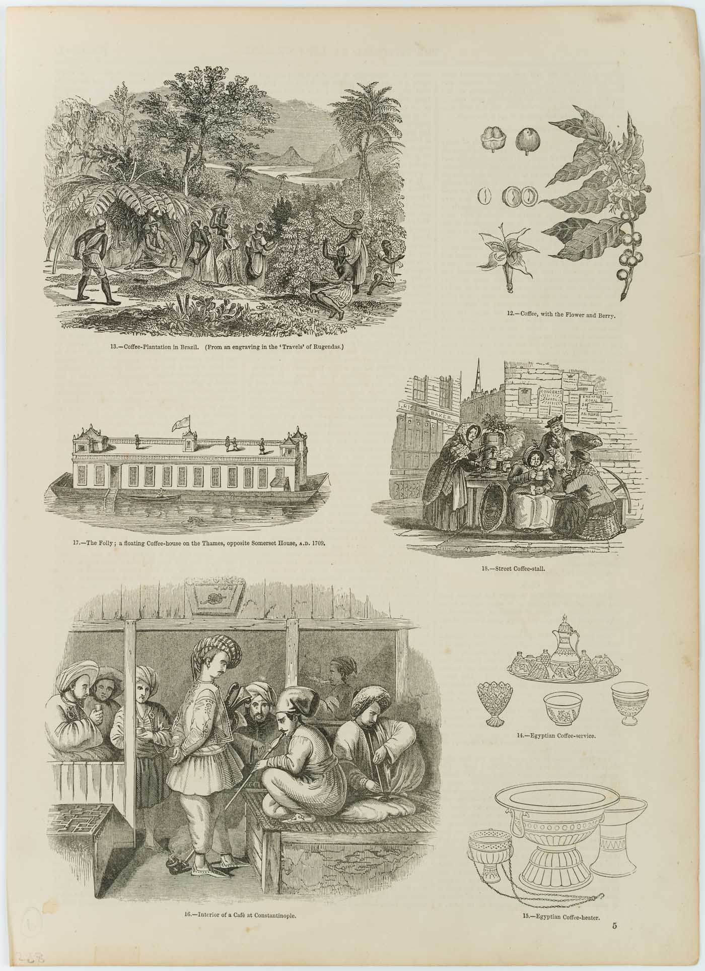• Description: Illustrations from “The Pictorial Gallery of Arts” on coffee cultivation and consumption. Below the illustration of a Brazilian coffee plantation with coffee farmers and a botanical illustration of a coffee plant. In the centre right the illustrations of a market stall selling coffee, in front of which two figures are drinking a hot cup of coffee.