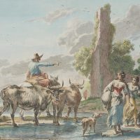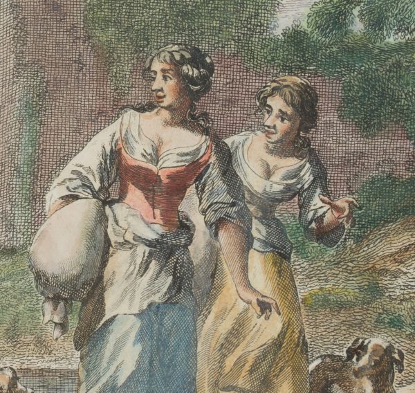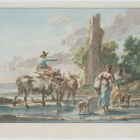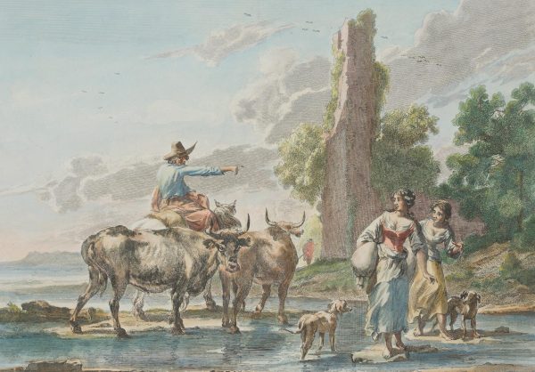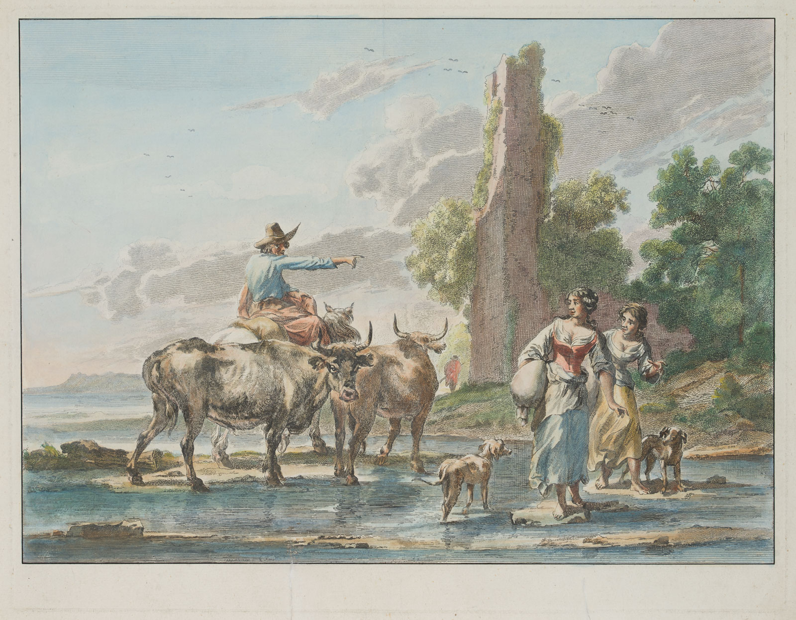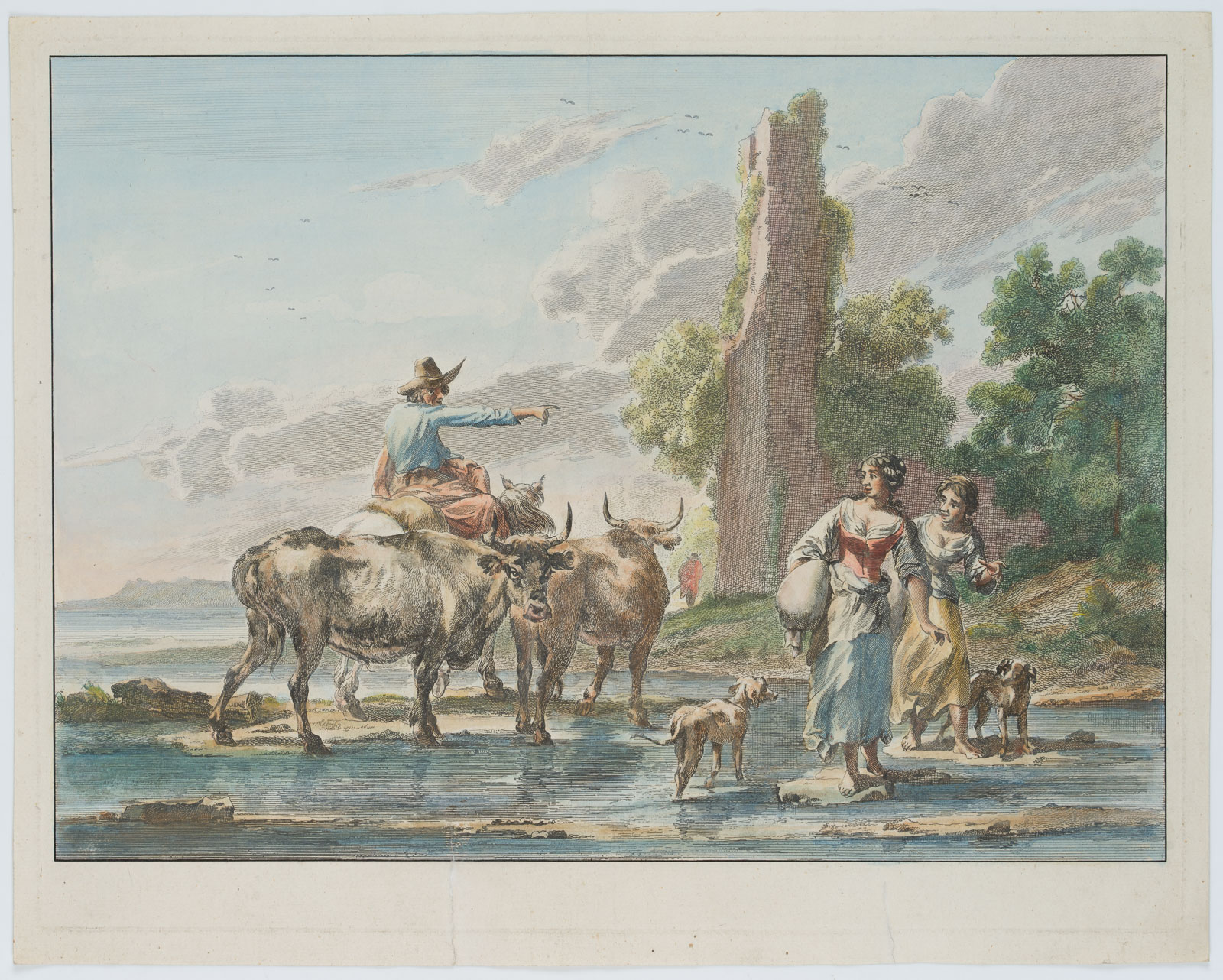 Unbekannt (19. Jahrhundert), In der Furt, Kühe und junge Bäuerinnen, im Hintergrund mit Ruine, 1860, Radierung