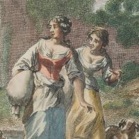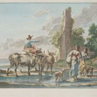 Unknown (19th century), In the ford, cows and young farm women, in the background with ruin, 1860, Etching
