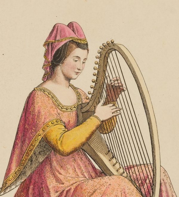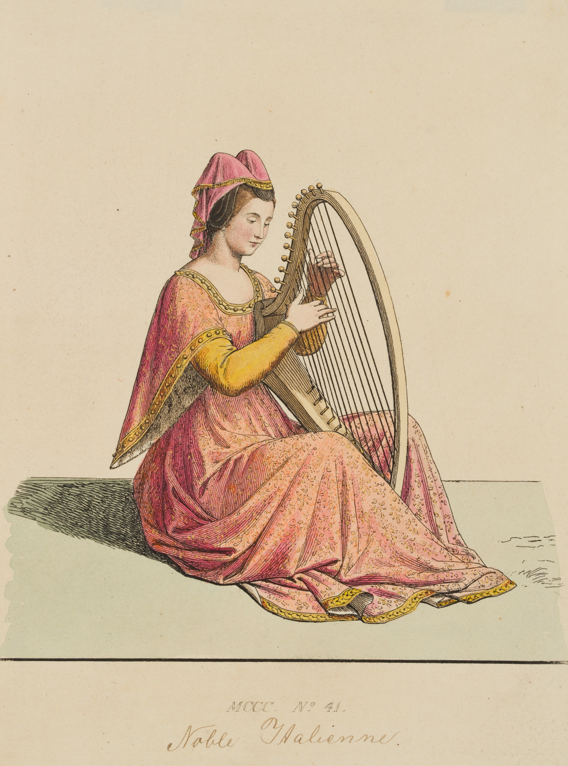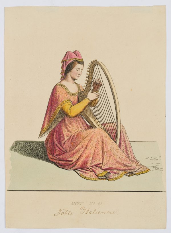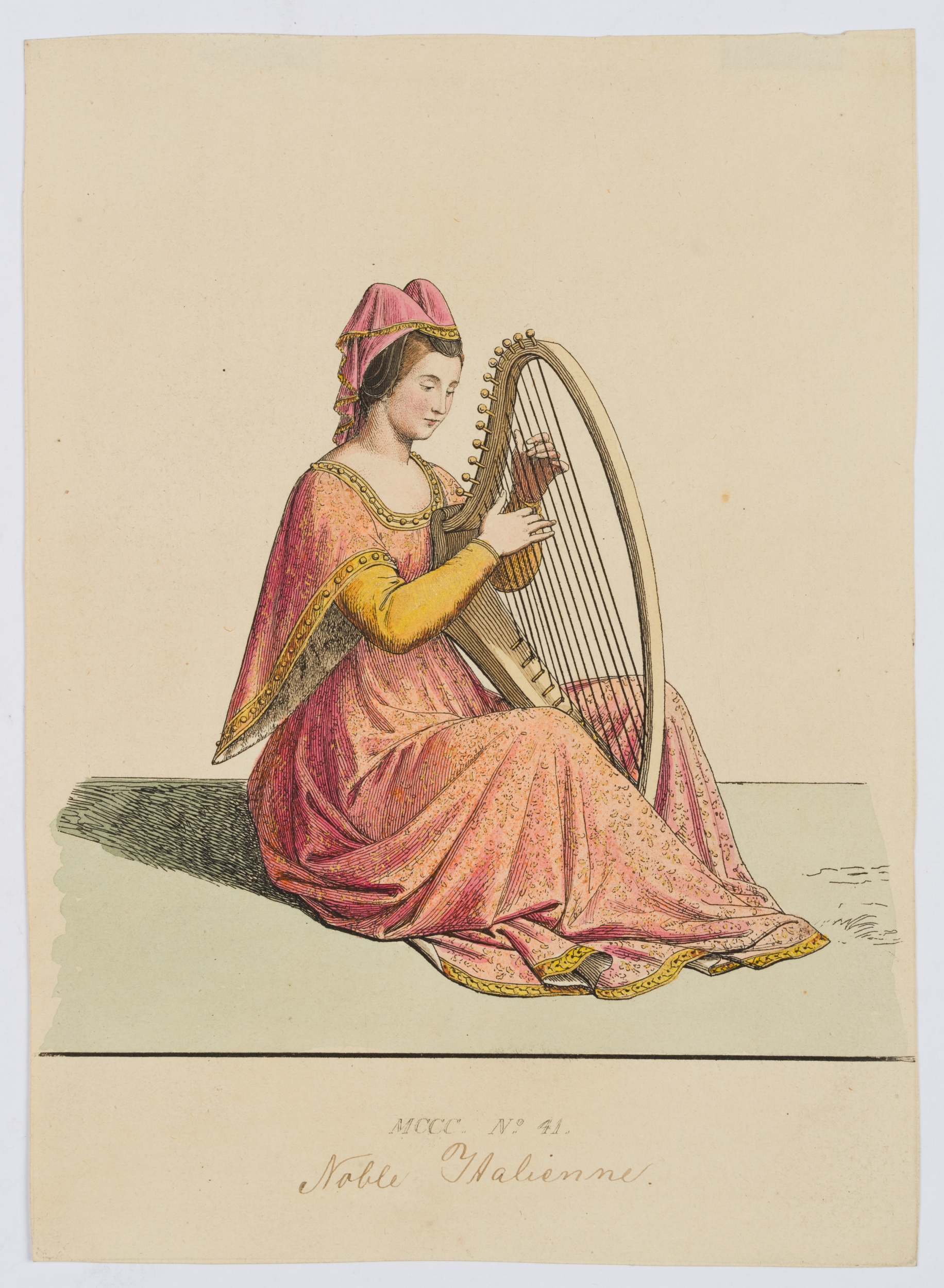 - Description: Depiction of a noble Italian woman playing the harp. The elaborate medieval garb is delicately painted in watercolour. The depiction probably originates from a series of pictures of historical fashion or costumes.