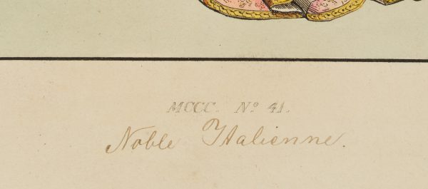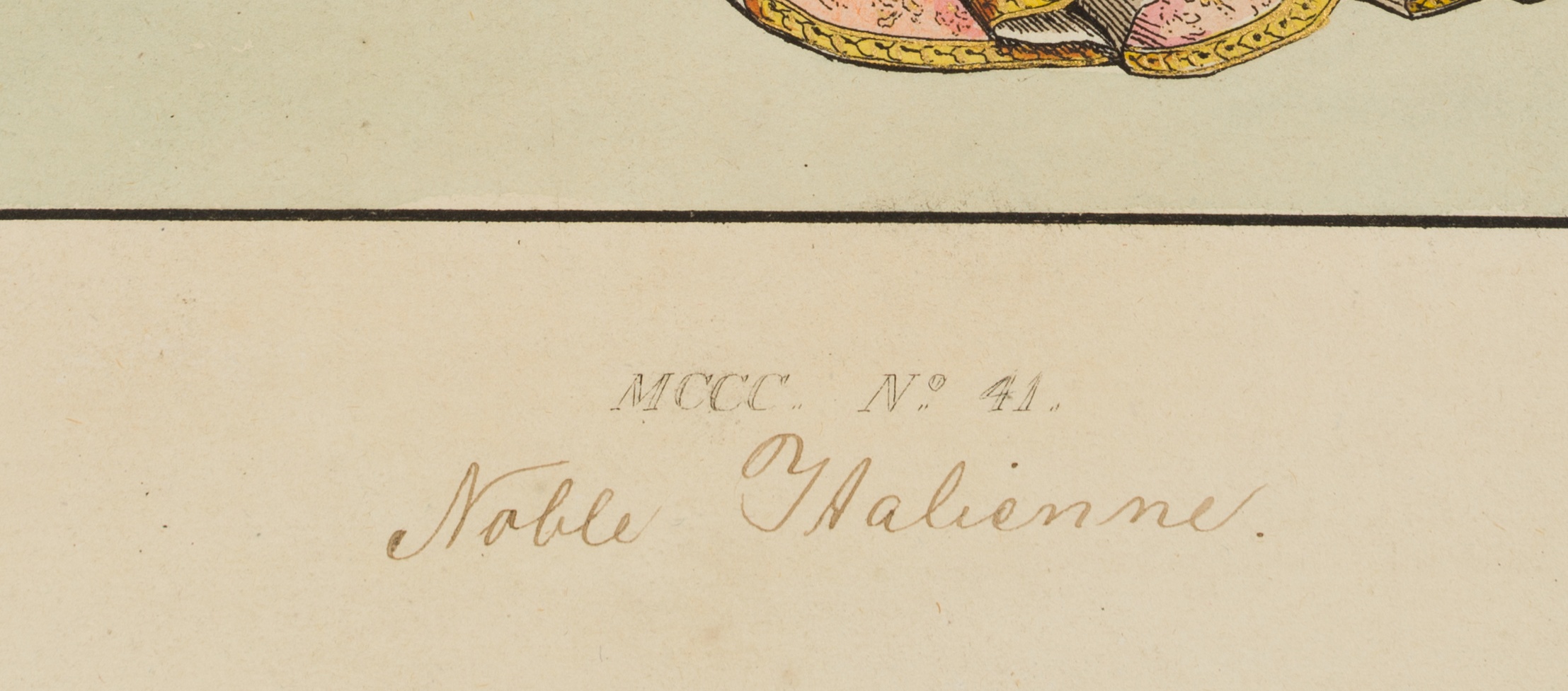 - Inscription: Lower middle inscribed by another person: “Noble Italienne”. Lower middle numbered in the printing plate: “MCCC. No. 41”.