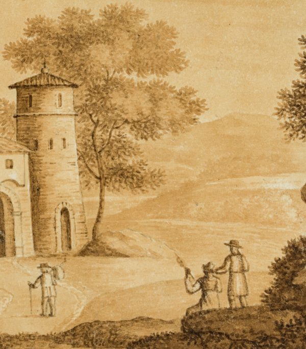 Blick in einer hügelige Landschaft, in der im Mittelgrund zwei Rückenfiguren zu erkennen sind. Sie blicken in Richtung eines Wanderers, der auf dem Weg in das nahegelegene Dorf zu sein scheint. Eine Stadtmauer und ein wehrhafter Turm umgeben die Stadt, deren Dächer sich hinter der Mauer abzeichnen.