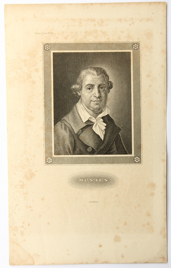 - Beschreibung: Porträt des Johann Karl August Musäus(1735 Jena – 1787 Weimar) Schriftsteller, Philologe und Märchensammler, Stahlstich. Beschreibung: Stahlstich auf Papier. Unterhalb der Darstellung in Druckplatte mit dem Namen des Dargestellten versehen.