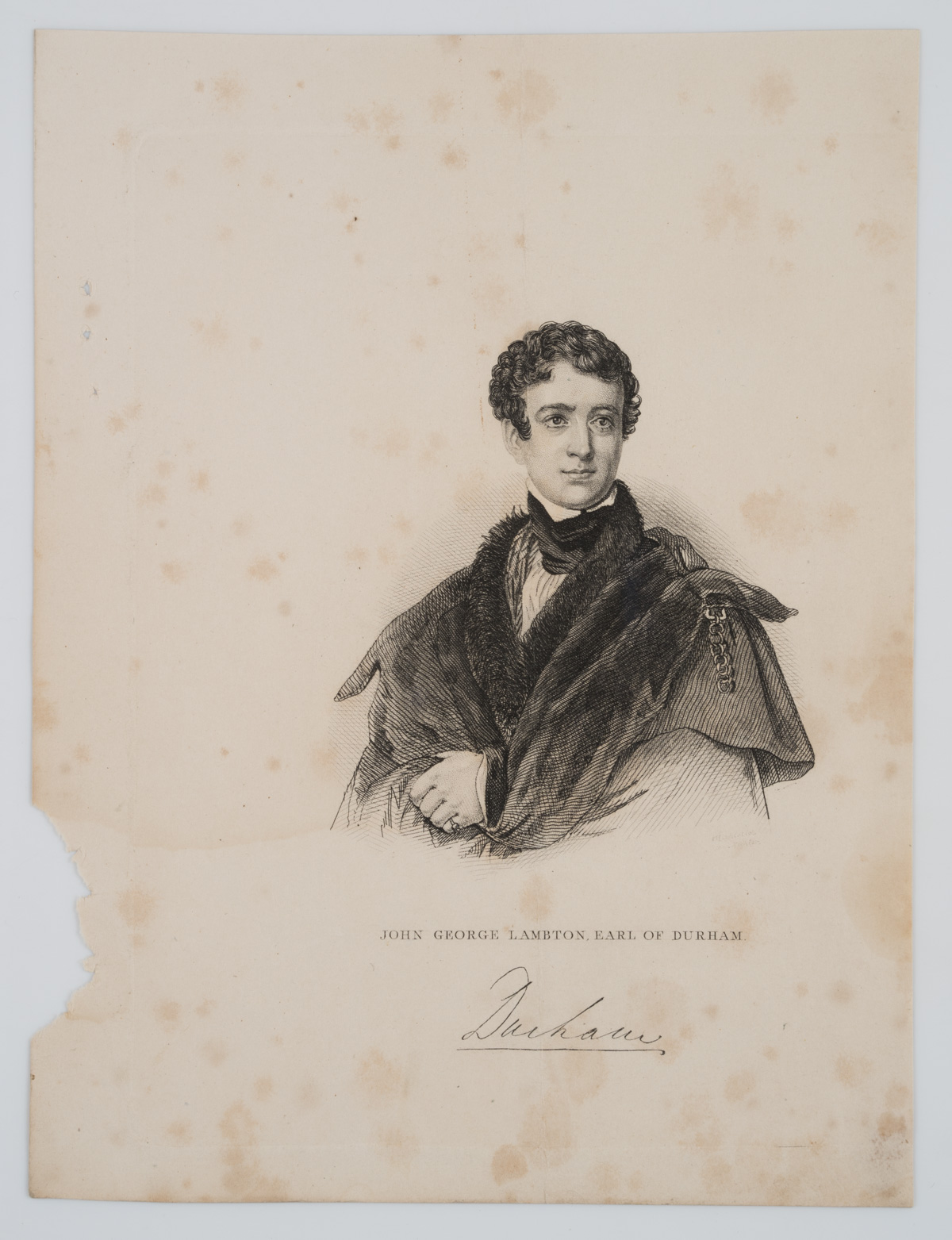 - Bezeichnung: Unterhalb mit dem Namen des Dargestellten “JOHN GEORGE LAMBTON EARL OF DURHAM” beschriftet, darunter die faksimilierte Unterschrift des Porträtierten: “Durham”.