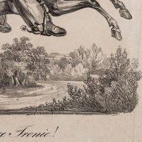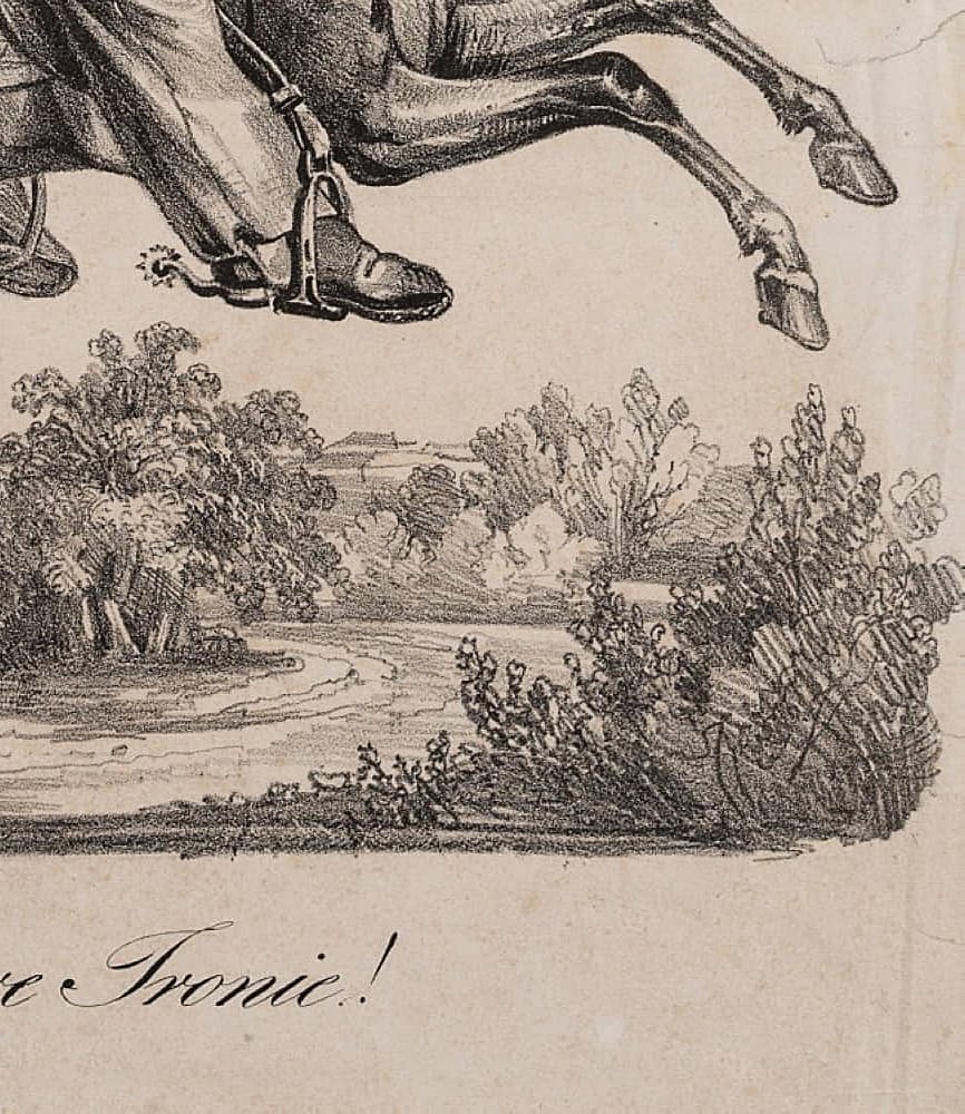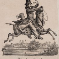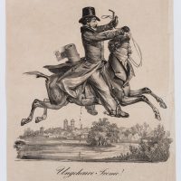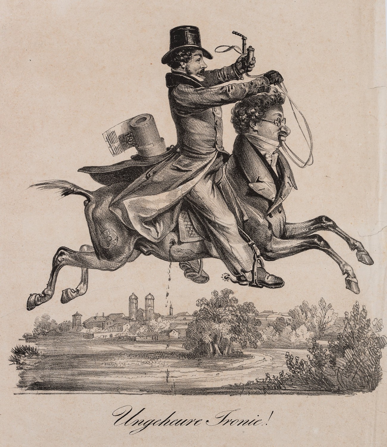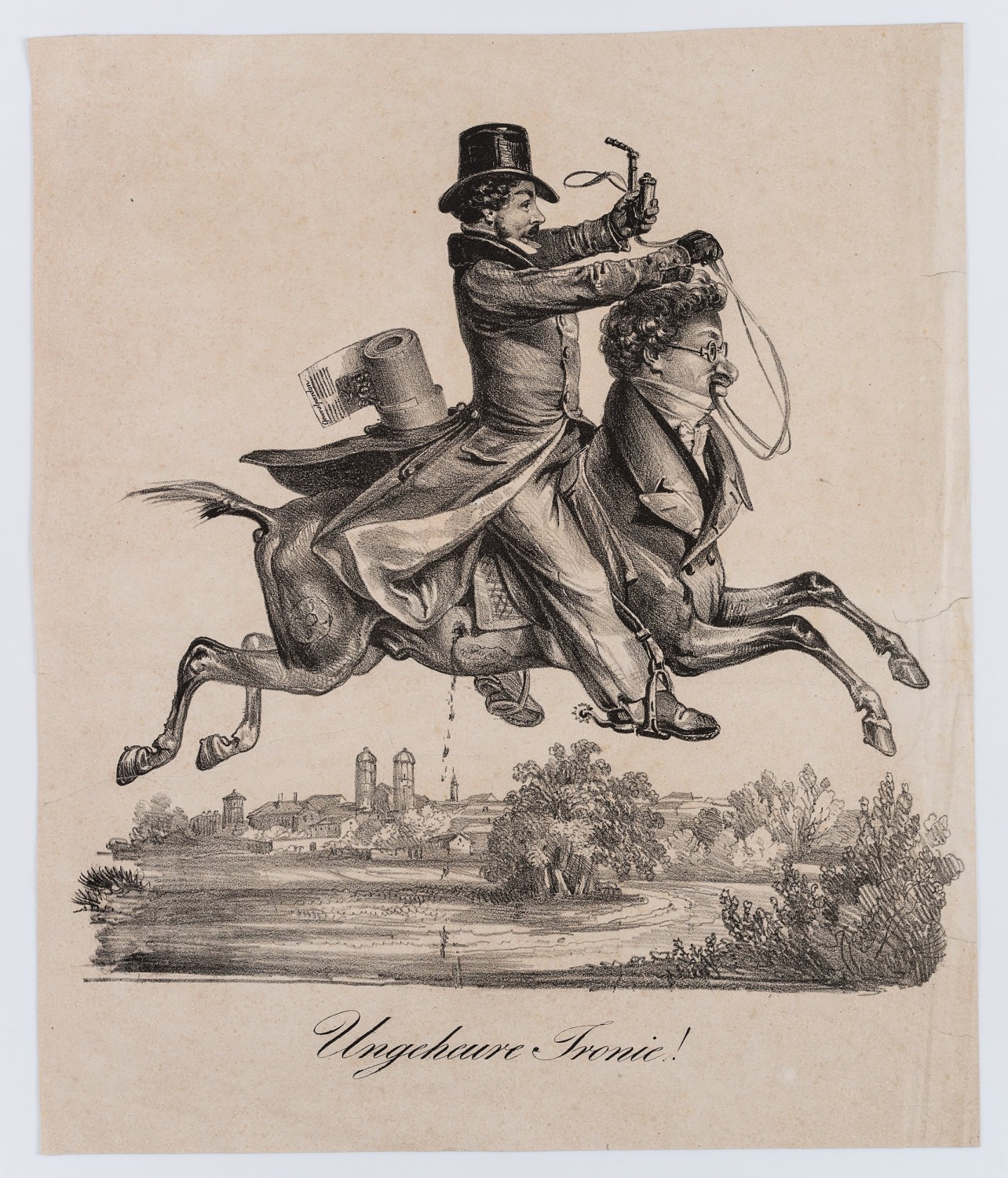 Unbekannt (19. Jahrhundert), “Ungeheure Ironie!”, Der Maler Jacob Friedrich Hahn reitet den Journalisten Moritz Gottlieb Saphir als Zentauren, Karikatur, Gesellschaftssatire, um 1830, Lithographie
