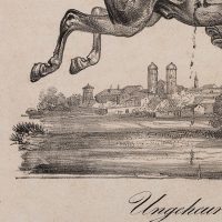 - Beschreibung: Der Maler Jacob Friedrich HAHN (um 1805 Nürnberg – um 1870 ebd.) reitet den Journalisten Moritz Gottlieb SAPHIR (eigentlich Moses Saphir, 1795 Lauschbrünn – 1858 Baden) als Zentauren. Bissige Satire auf den Streit zwischen dem Maler Jacob Friedrich Hahn und demittig Schriftsteller und Journalisten Moritz Gottlieb Saphir, der am 27. November 1830 eskalierte, als Hahn Saphir auf offener Straße verprügelte.