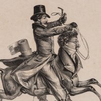 Unknown (19th century), “Monstrous irony!”, The painter Jacob Friedrich Hahn rides the journalist Moritz Gottlieb Saphir as a centaur, Caricature, Social satire, c. 1830, Lithography