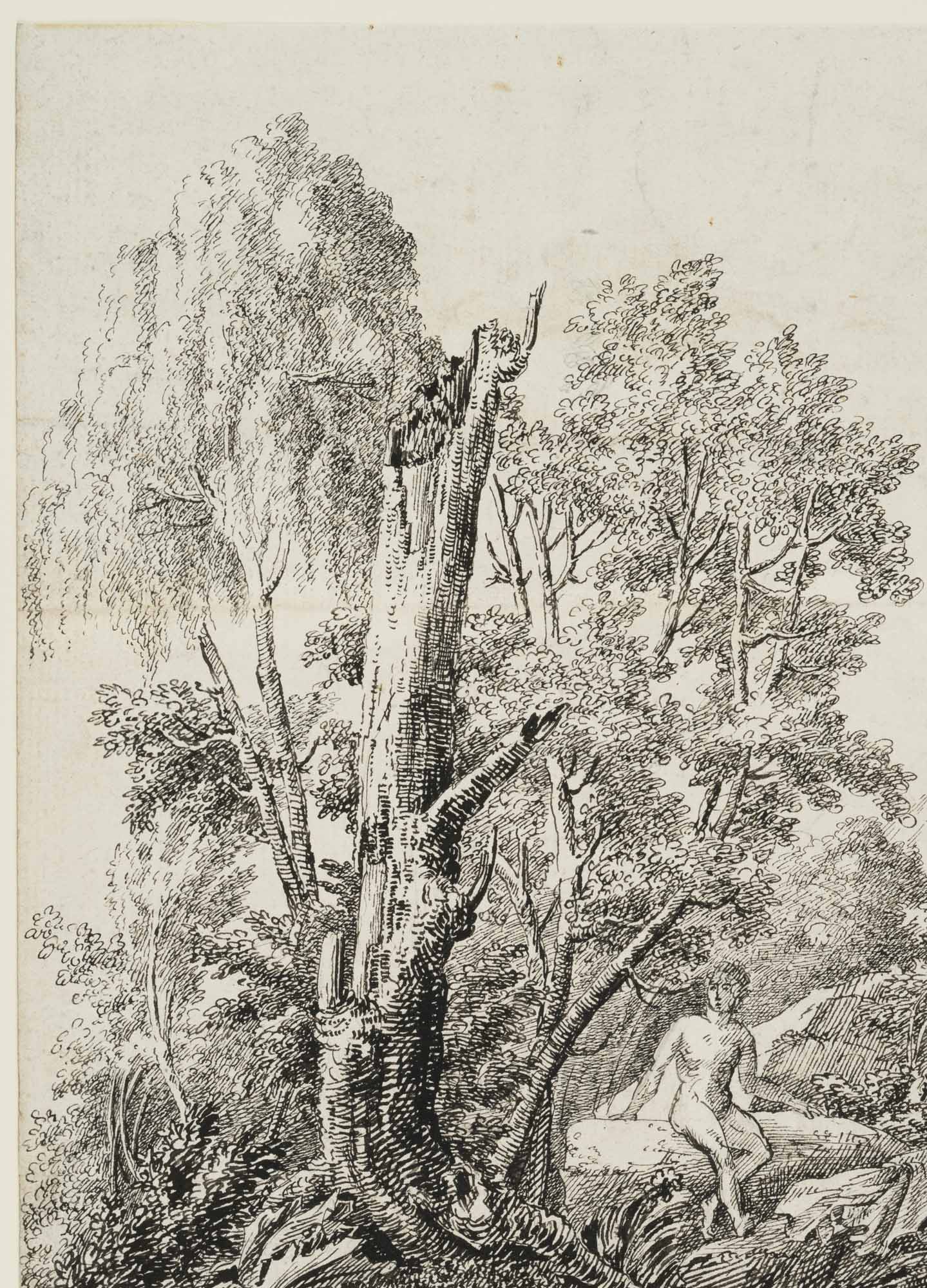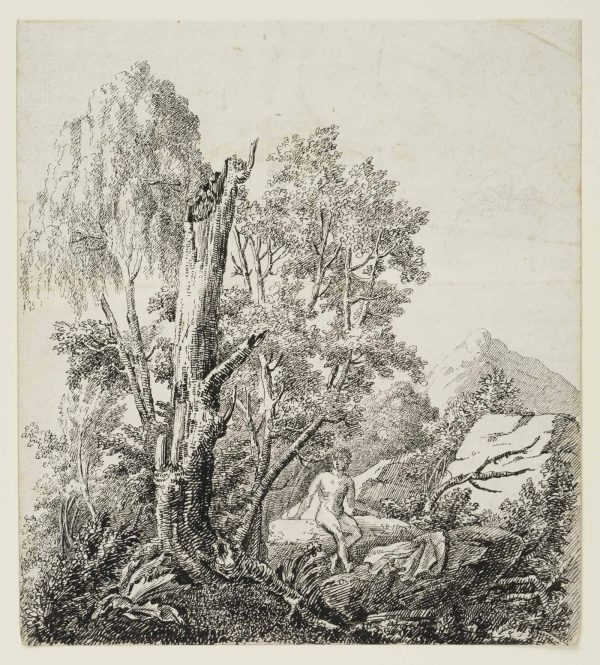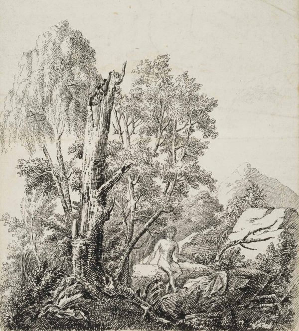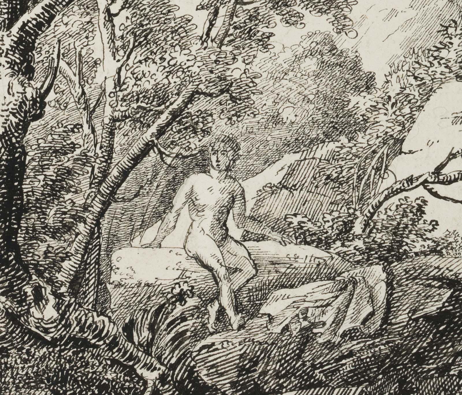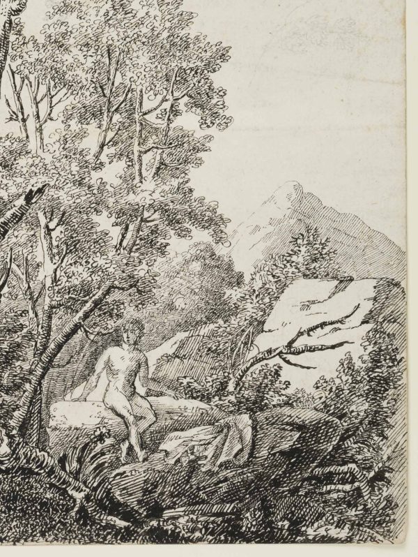 - Beschreibung: Detailreiche Federzeichnung mit einem Jüngling in felsiger Berglandschaft mit einem abgebrochenen Baum. Umgeben von üppiger Vegetation hat sich der Nackte auf einem großen Felsen neben dem toten Baum niedergelassen, das Gewand auf einem anderen, etwas kleineren Felsen abgelegt. Im Hintergrund erhebt sich ein spitzer Bergrücken in der Ferne.