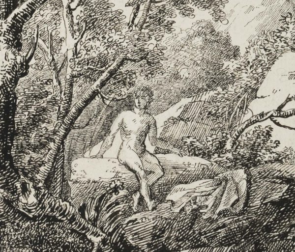 - Description: Detailed pen-and-ink drawing of a youth in a rocky mountain landscape with a broken tree. Surrounded by lush vegetation, the naked man has settled down on a large rock next to the dead tree, his robe laid down on another, somewhat smaller rock. In the background, a pointed mountain ridge rises in the distance.
