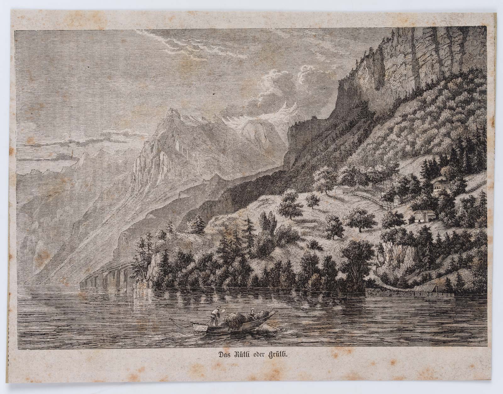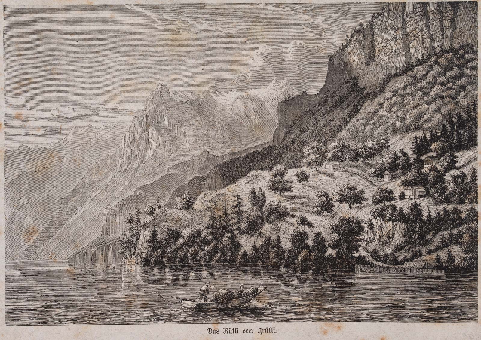 Unbekannt (19. Jahrhundert), Kahn auf dem Vierwaldstättersee am Rütli, Grütli, Schweiz, um 1850, Holzstich