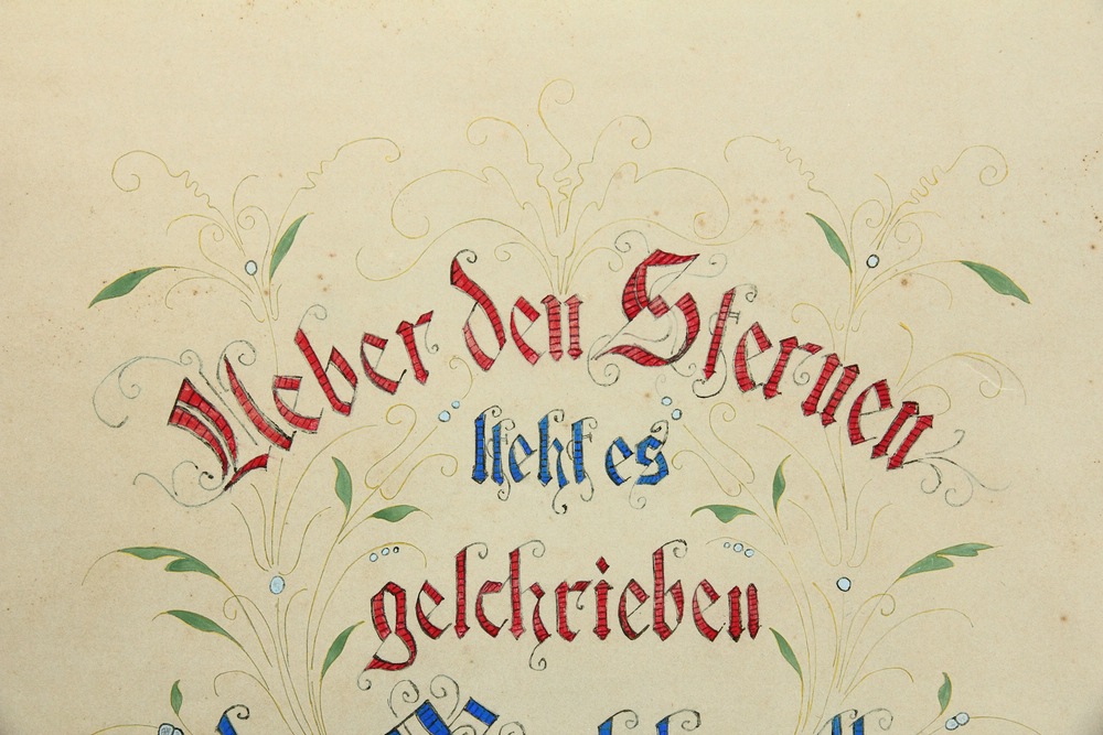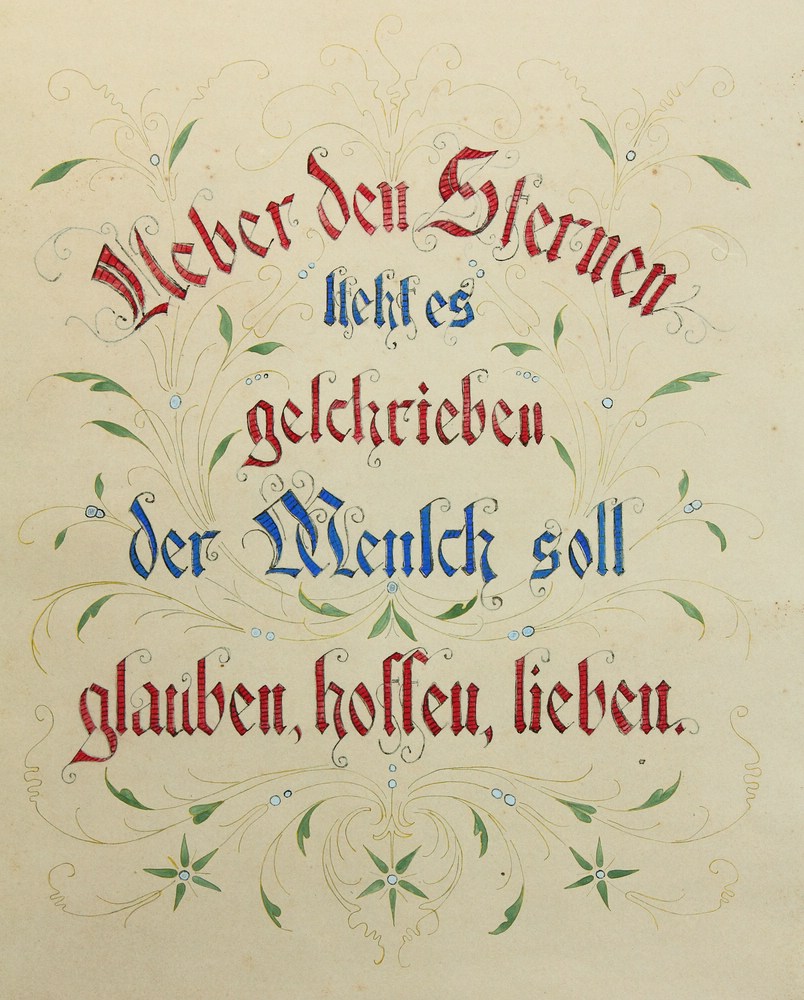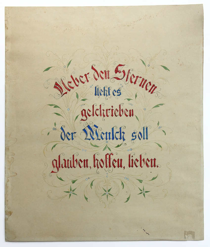 Unbekannt (19. Jahrhundert), Kalligraphischer Sinnspruch, Ueber den Sternen, um 1880, Tusche