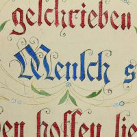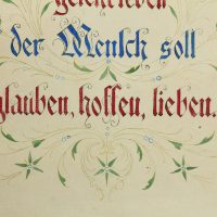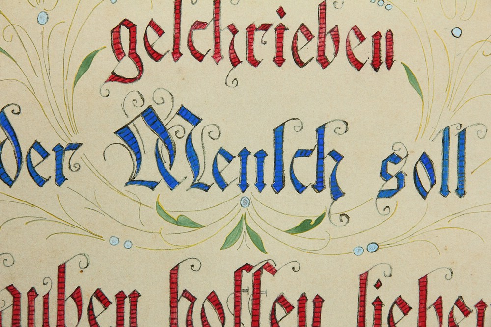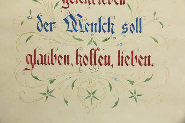- Beschreibung: Kunstvoller kalligraphischer Sinnspruch in einer gebrochenen Schriftart, Fraktur oder Textur, eingebettet in filigrane florale Ornamente.