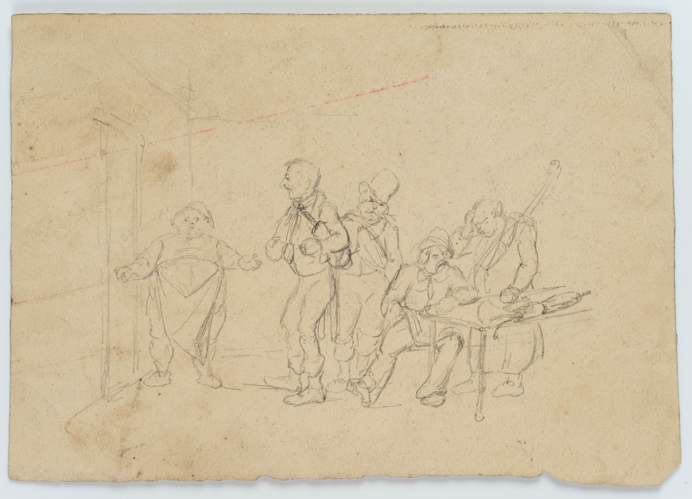 - Description: Satirical drawings by an anonymous Danish artist. Recto is a full-length depiction of an officer with caricaturing features, hurriedly walking along with a candlestick and pipe. Verso is a satirical scene of a group of musicians in an inn.