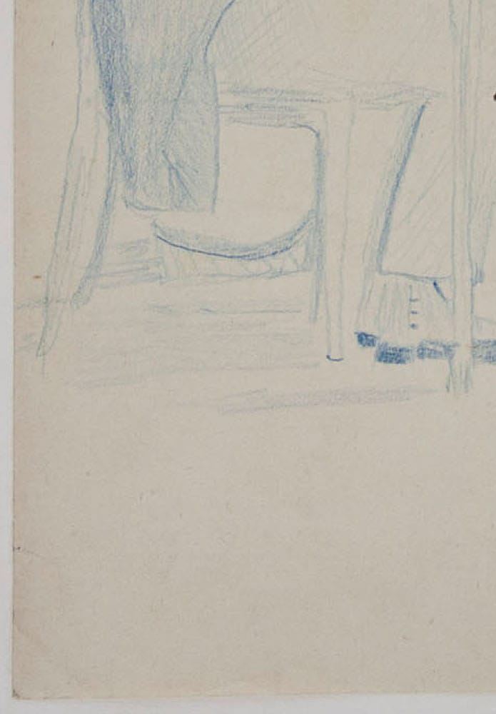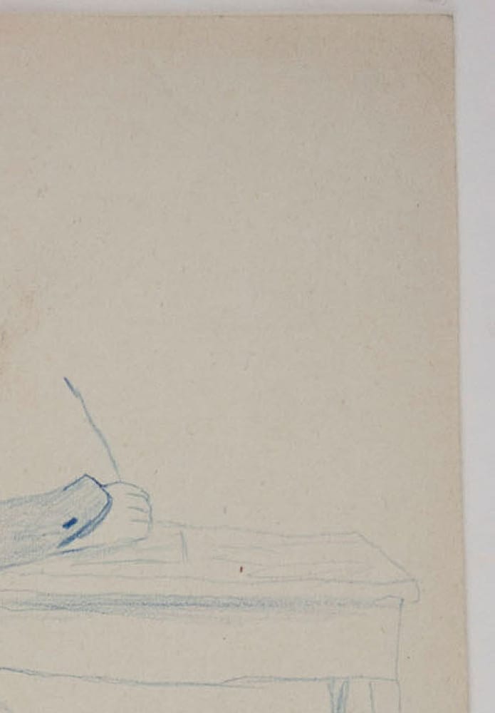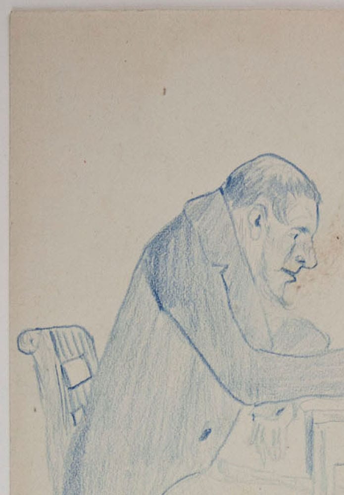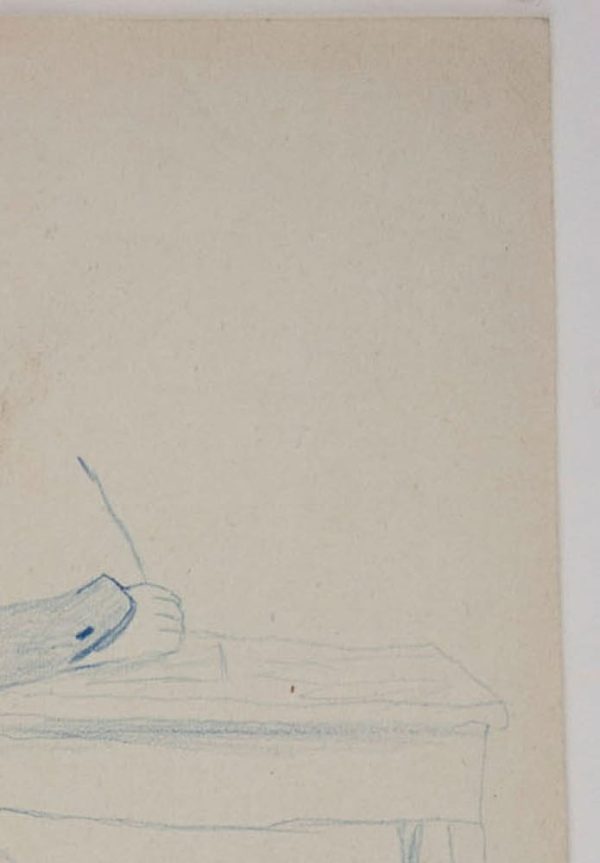 - Beschreibung: Karikatur, Schreibender Mann, um 1870, Deutsch. Beschreibung: Original Zeichnung in Blau auf Papier.