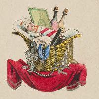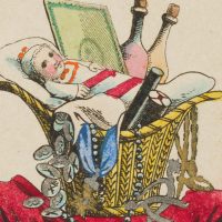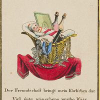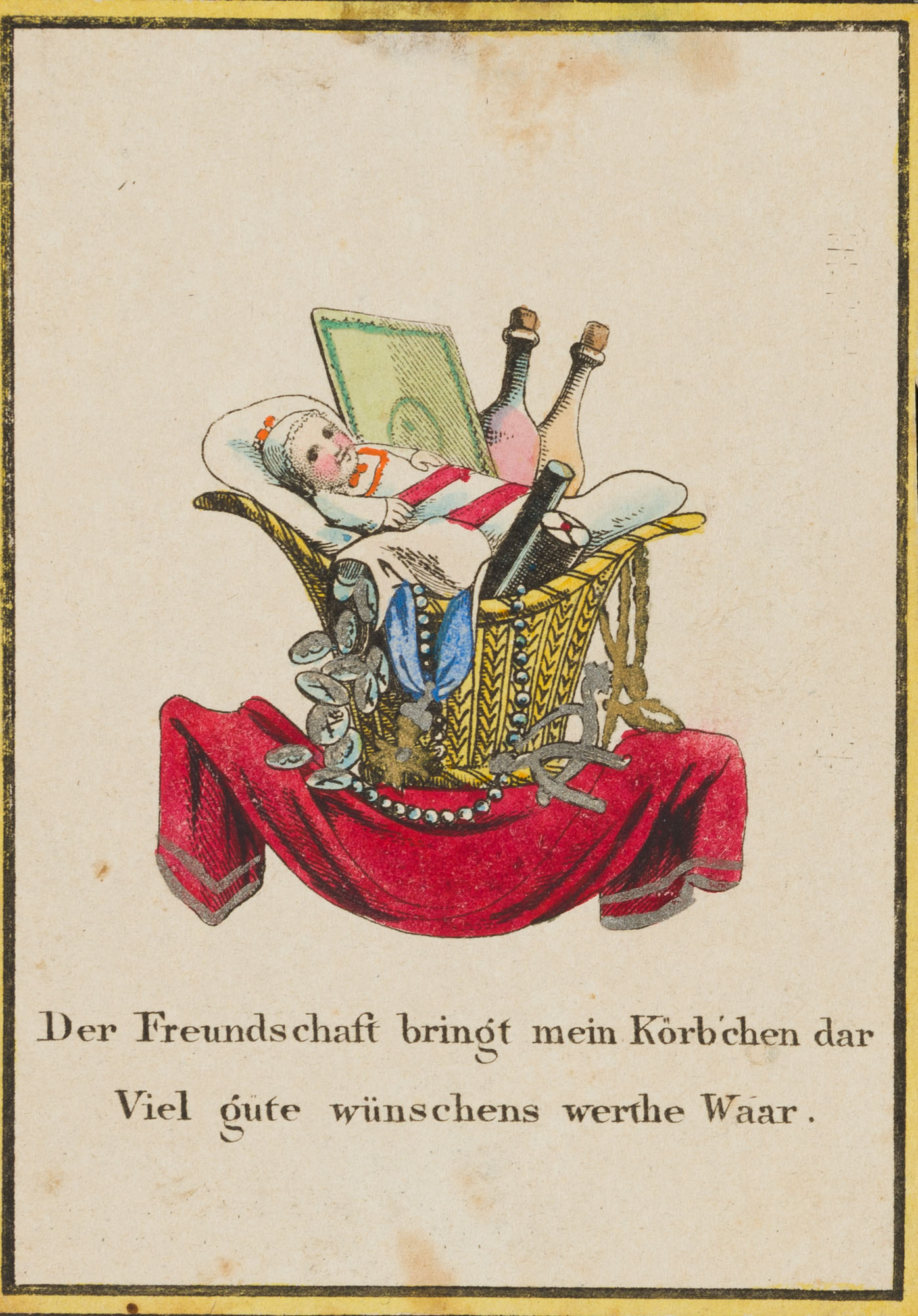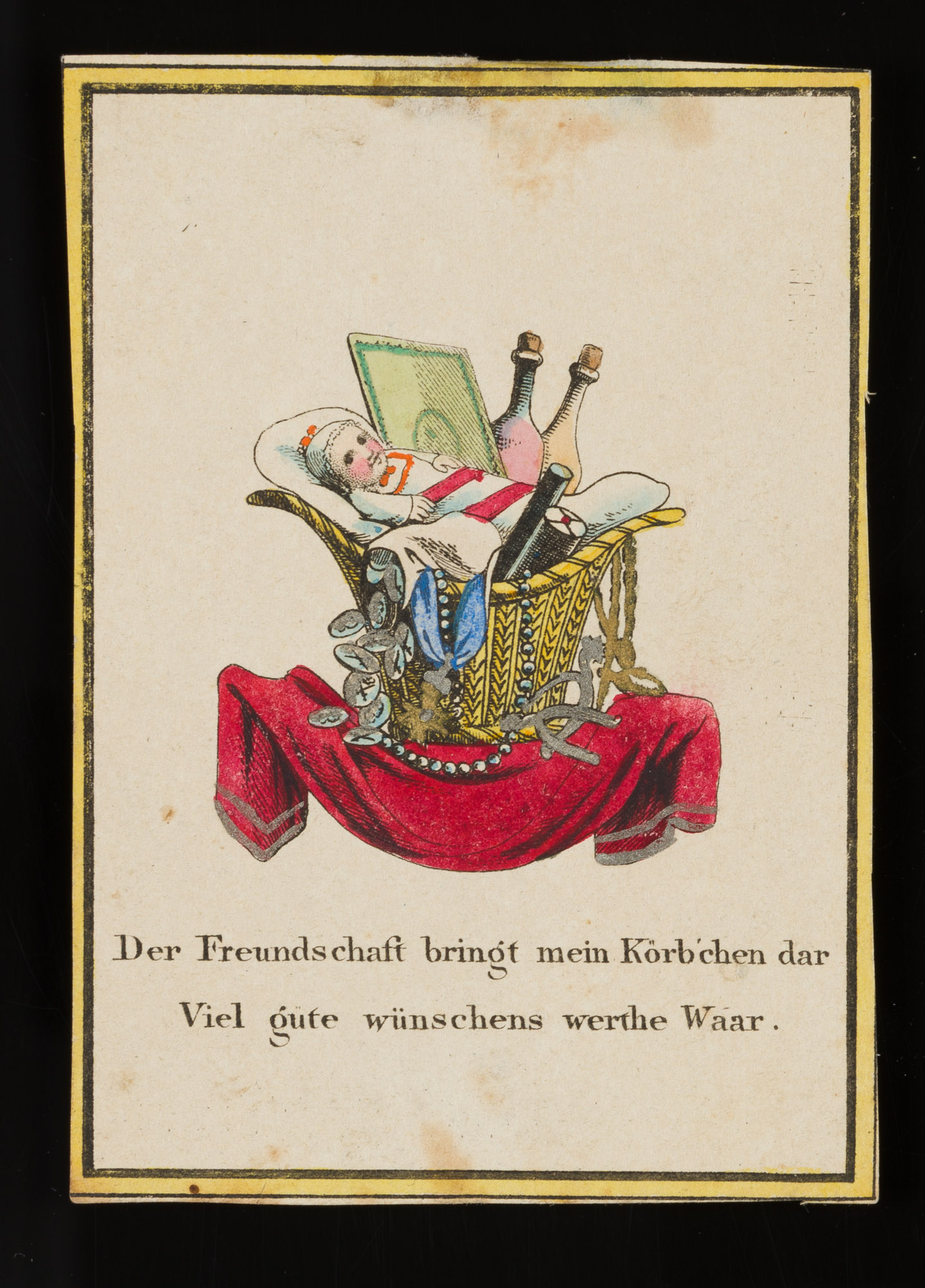 - Beschreibung: Die Präsente im Korb lassen sich als symbolische Geschenke lesen. Der Säugling, die Sektflaschen, die Hufeisen stehen für Kindersegen, Glück und Fröhlichkeit. Kolorierte Radierung auf Papier