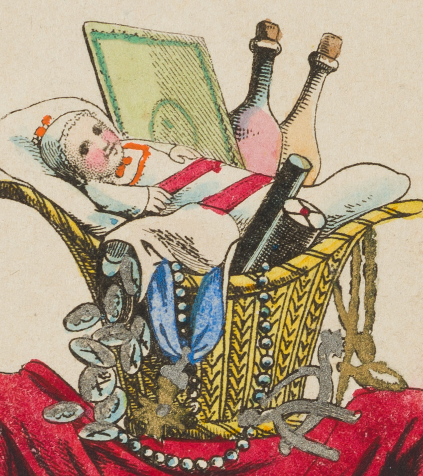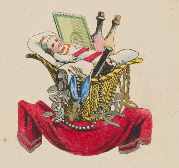 - Description: The presents in the basket can be read as symbolic gifts. The baby, the champagne bottles, the horseshoes stand for child blessing, happiness and cheerfulness.