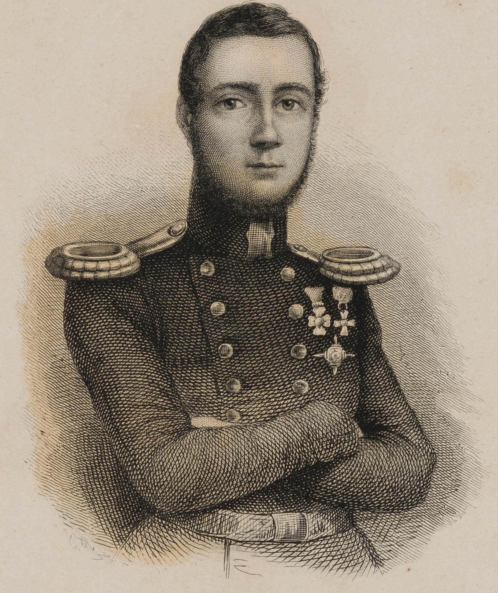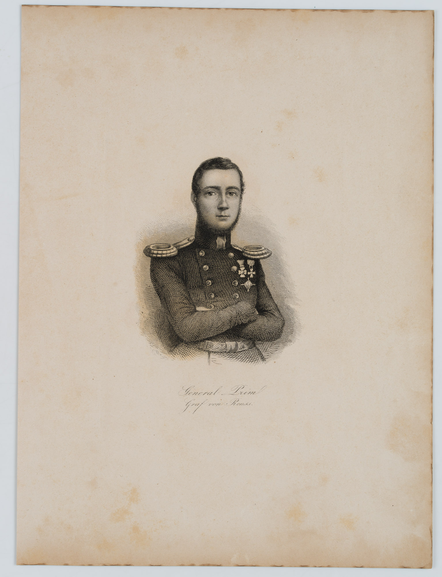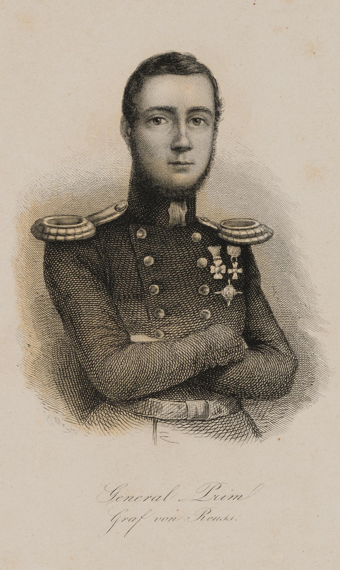 Unknown (19th century), Portrait of General Juan Prim (1814 Reus, Spain – 1870 Madrid), Catalan general and politician as well as Prime Minister of Spain Half-length portrait in uniform with folded arms and frontal view, 19th century, Steel engraving