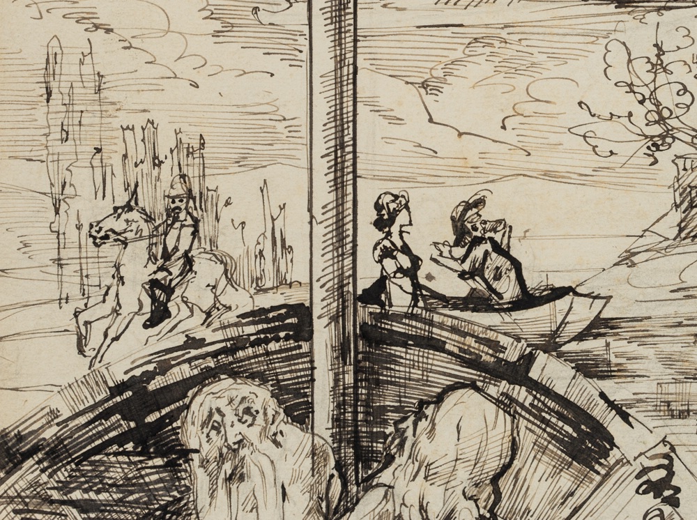 - Description: Multipart depiction with allegorical or fairy-tale scenes. In the foreground, two trolls, dwarfs or human-like goblins are chained to a pole with a palette on top on which some boyish figures or putti are dancing and playing music. In the background is a knight on a horse and a nobleman rowing a lady across a lake to an old castle.