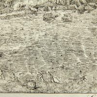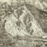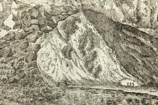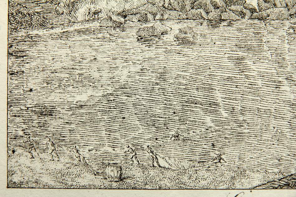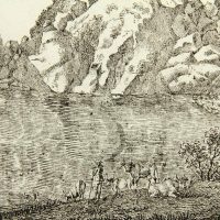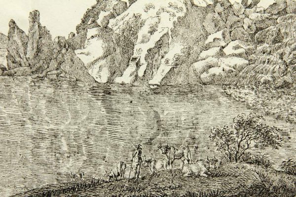 - Description: Pen-and-ink lithograph with a landscape at a lake surrounded by craggy rocks in the southeastern French landscape Dauphiné. On the shore some men are fishing with a large net while on a hill in the foreground a shepherd stands with some cattle and looks dreamily over the smooth water surface.