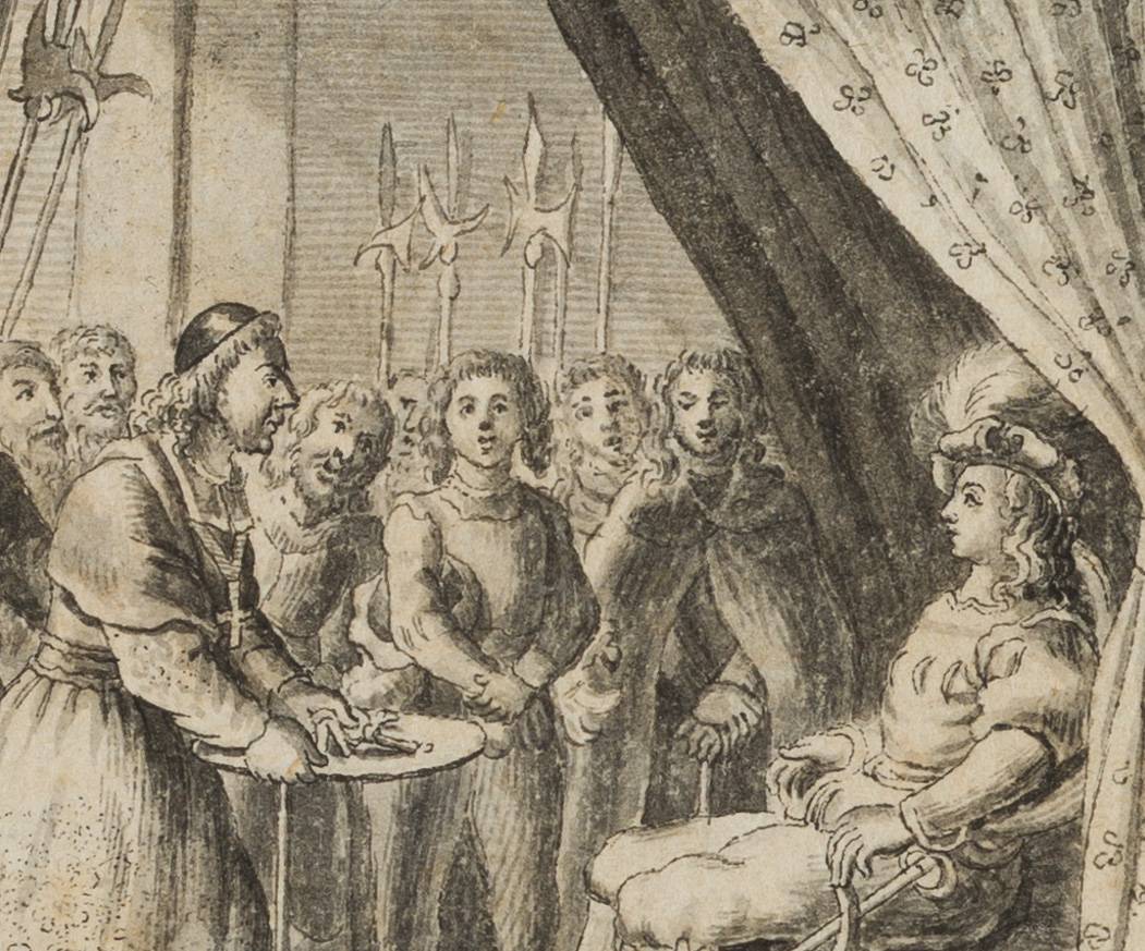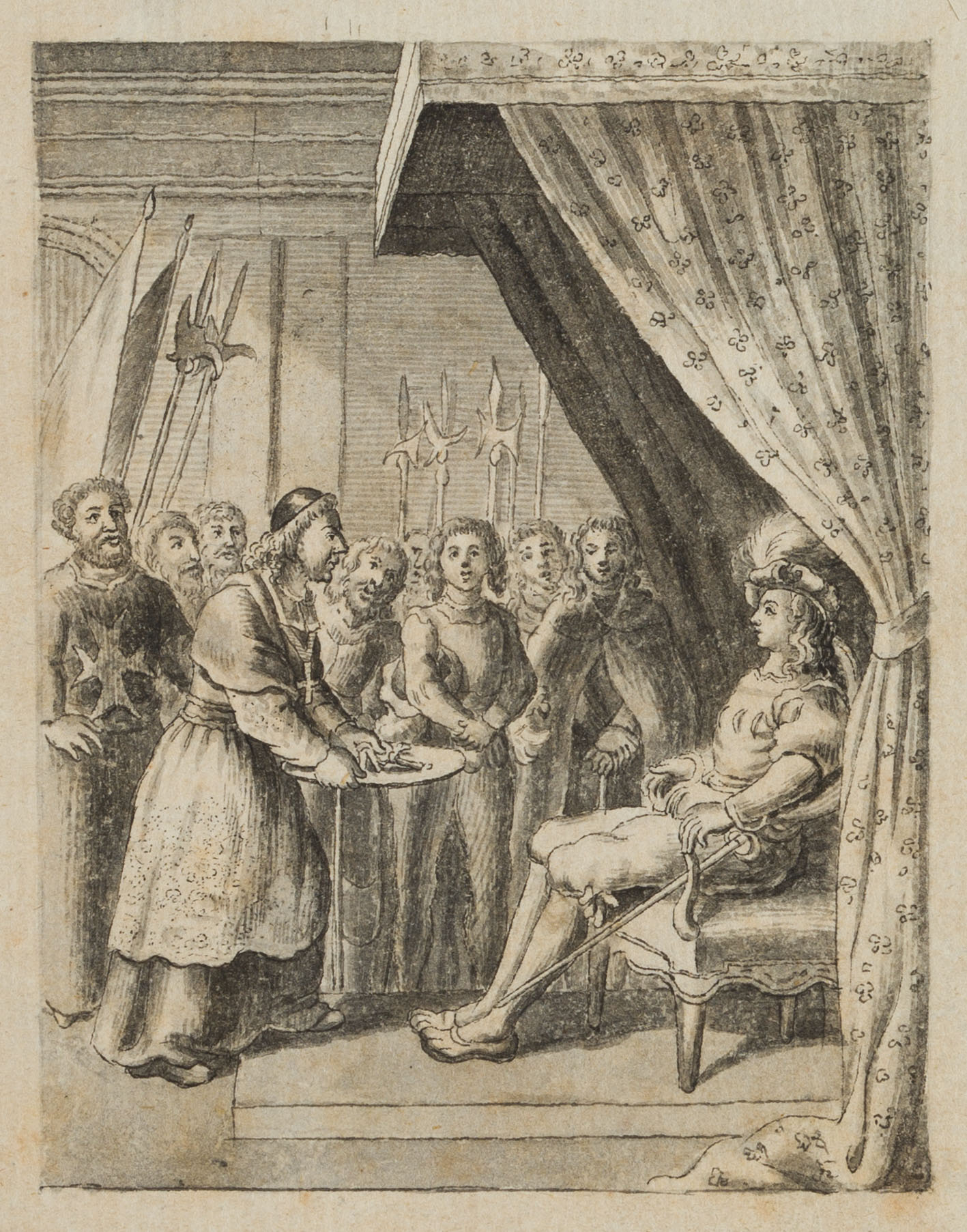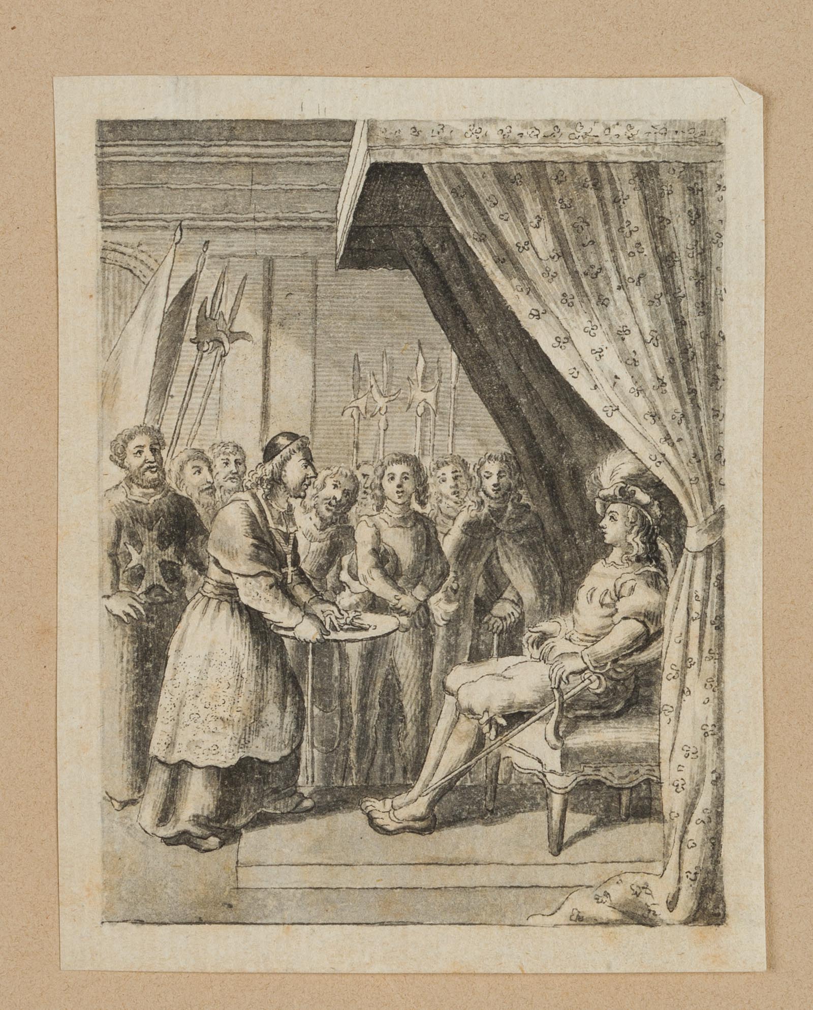 Unbekannt (19. Jahrhundert), König Philipp August empfängt die Schlüssel v. Jerusalem, 19. Jahrhundert, Radierung