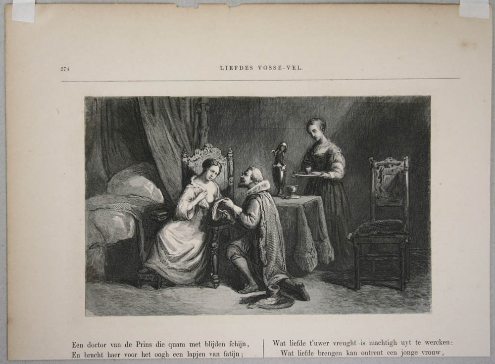 - Description: Wood engraving by an anonymous artist on a complete (once bent) book page, inscribed: “Liefdes vosse-vel.” Very high quality wood engraving. The doctor is not visiting a random patient here, obviously the doctor and patient are connected by the bond of love.