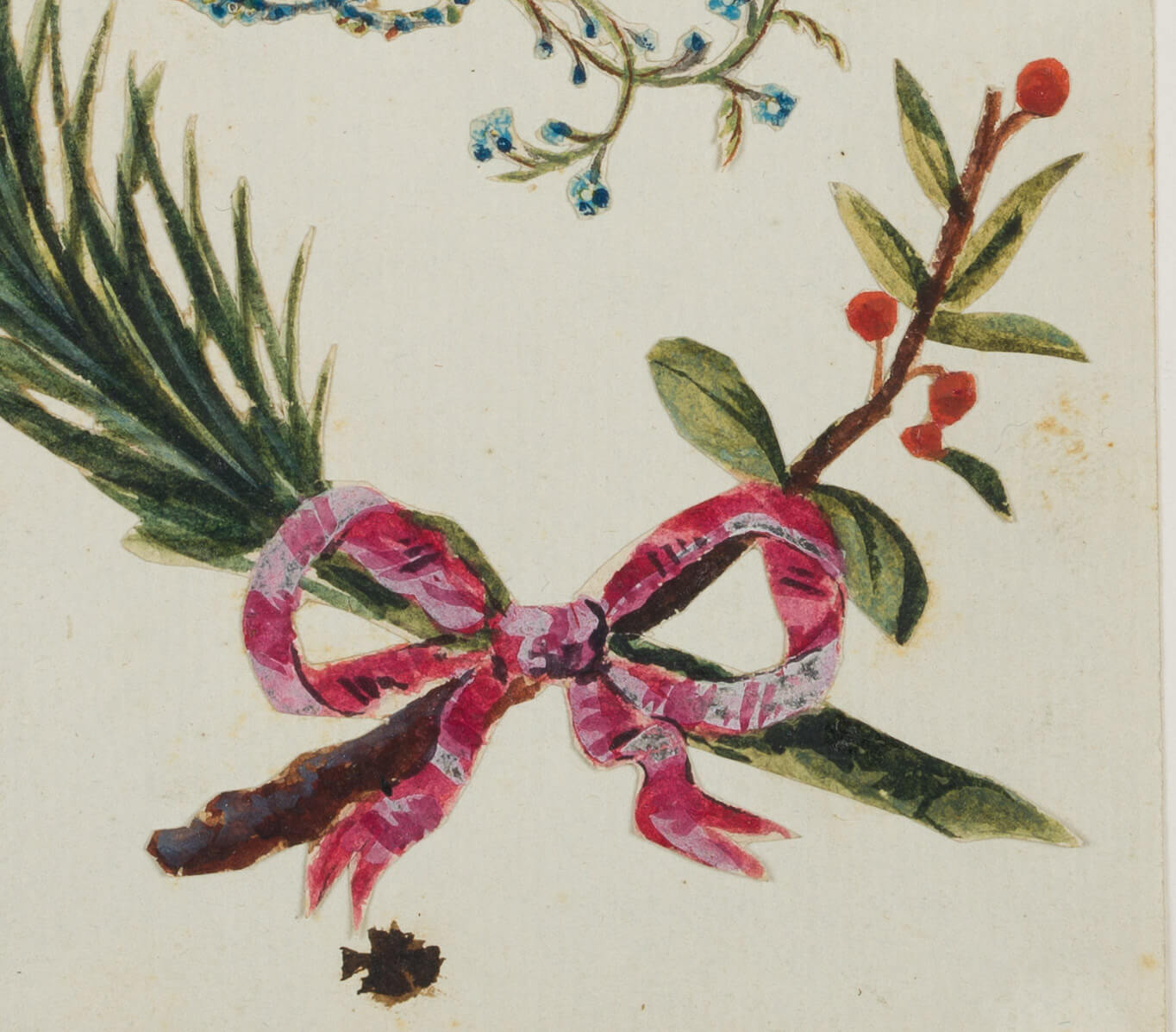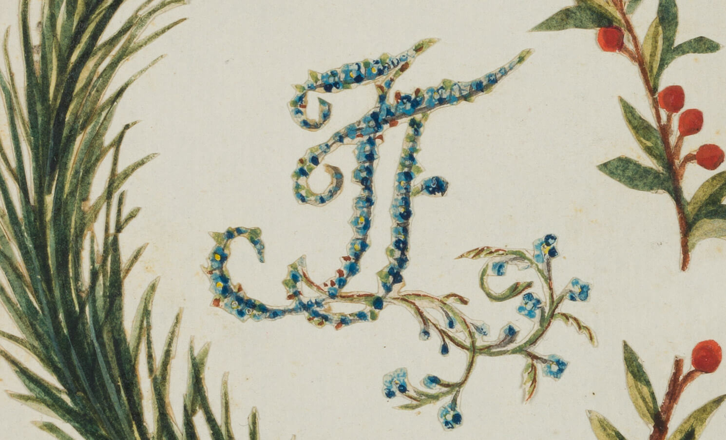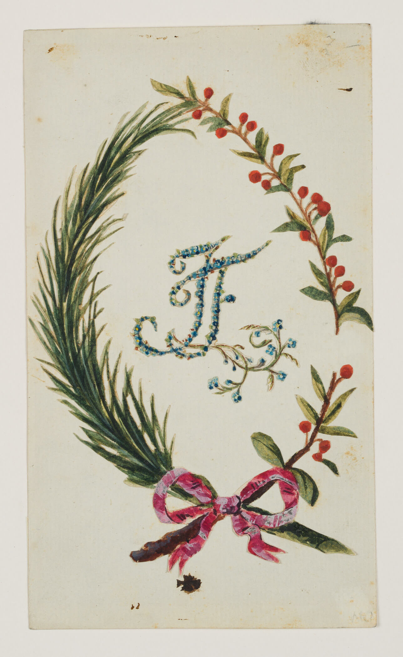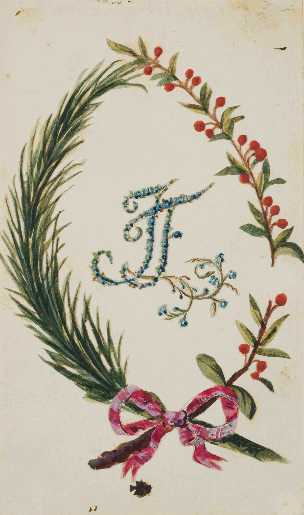 - Schlagworte: Stammbachblatt, kunstvoll, Handarbeit, filigran, Initialen, Karte, Grußkarte, Blumenkranz, Mode, Genre, Deutschland, Biedermeier, 1800-1849