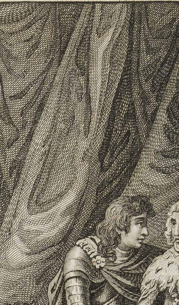 In einem Zelt in einem Feldlager kommen vier Männer zur Lagebesprechung zusammen. Der junge Ritter links spricht dem älteren Mann im Hermelinumhang, wahrscheinlich der Herrführer, gut zu. Vertraulich hält er die Hand und Schulter des Herrführers fest.